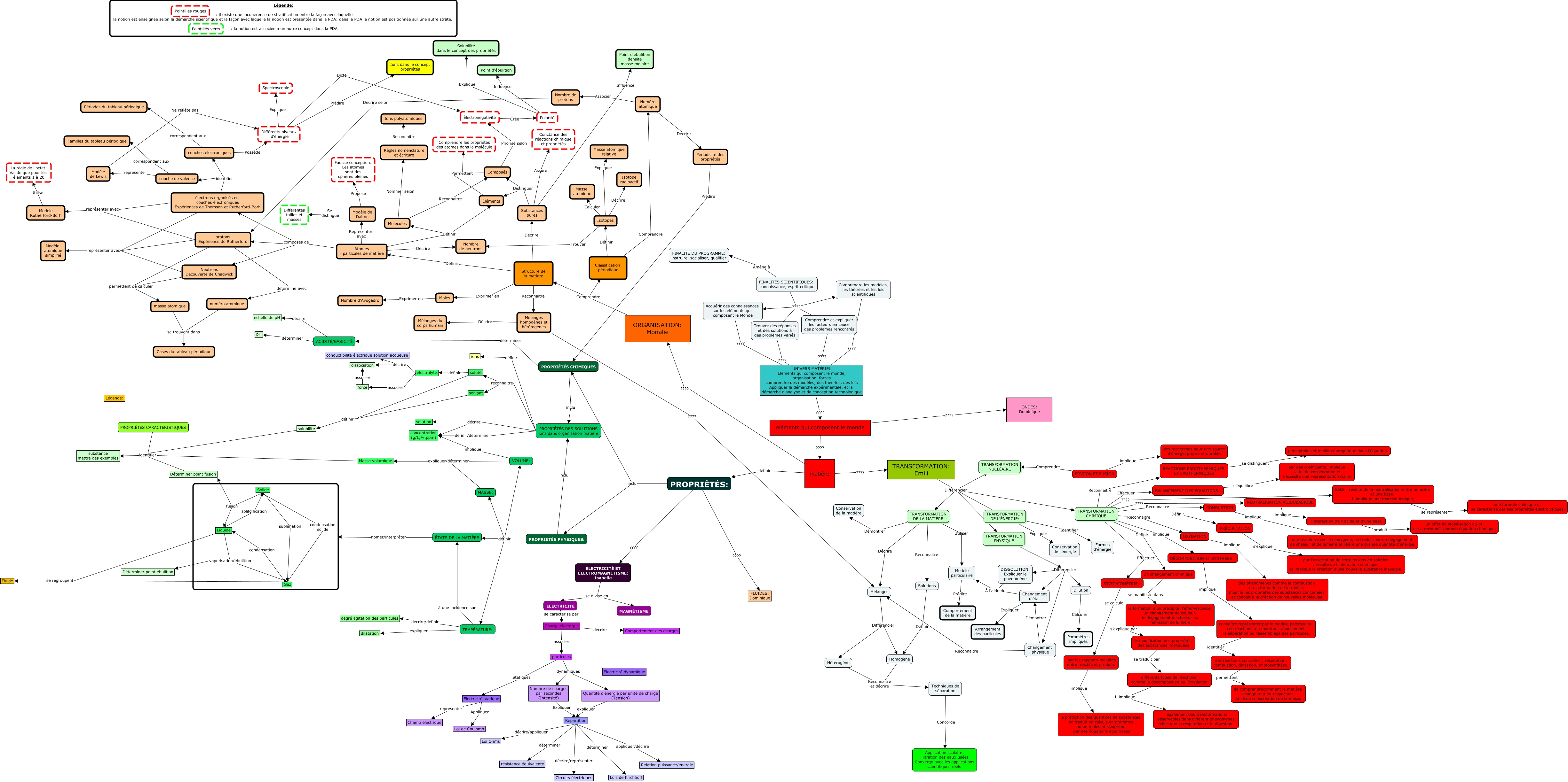 Cette carte de concepts créée avec IHMC CmapTools traite de: Équipe I carte à utiliser Monalie, Déterminer point ébulition identifier substance mettre des exemples, Atomes =particules de matière Représenter avec Modèle de Dalton, Molécules Reconnaitre Composés, SELS : résulte de la neutralisation entre un acide et une base. Il implique une réaction ionique, se représente une formule chimique et se caractérise par ses propriétés électrolytiques., ACIDITÉ/BASICITÉ déterminer pH, TEMPÉRATURE: expliquer dilatation, Neutrons Découverte de Chadwick représenter avec Modèle atomique simplifié, RÉACTIONS ENDOTHERMIQUES ET EXOTHERMIQUES se distinguent perceptibles et le bilan énergétique dans l’équation., couche de valence représenter Modèle de Lewis, DÉCOMPOSITION ET SYNTHÈSE : implique connaître représenter par le modèle particulaire ces réactions, en montrant visuellement la séparation ou l’assemblage des particules., Déterminer point fusion identifier substance mettre des exemples, force associer dissociation, Homogène Reconnaitre et décrire Techniques de séparation, Liquide vaporisation/ébulition Gaz, TRANSFORMATION CHIMIQUE Effectuer STŒCHIOMÉTRIE :, l’interaction d’un acide et d’une base. produit un effet de stabilisation du pH et se reconnaît par son équation chimique., Composés Permettent Comprendre les propriétés des atomes dans la molécule, FINALITÉS SCIENTIFIQUES: connaissance, esprit critique ???? Comprendre et expliquer les facteurs en cause des problèmes rencontrés, couche de valence correspondent aux Familles du tableau périodique, electrolyte décrire conductibilité électrique solution acqueuse