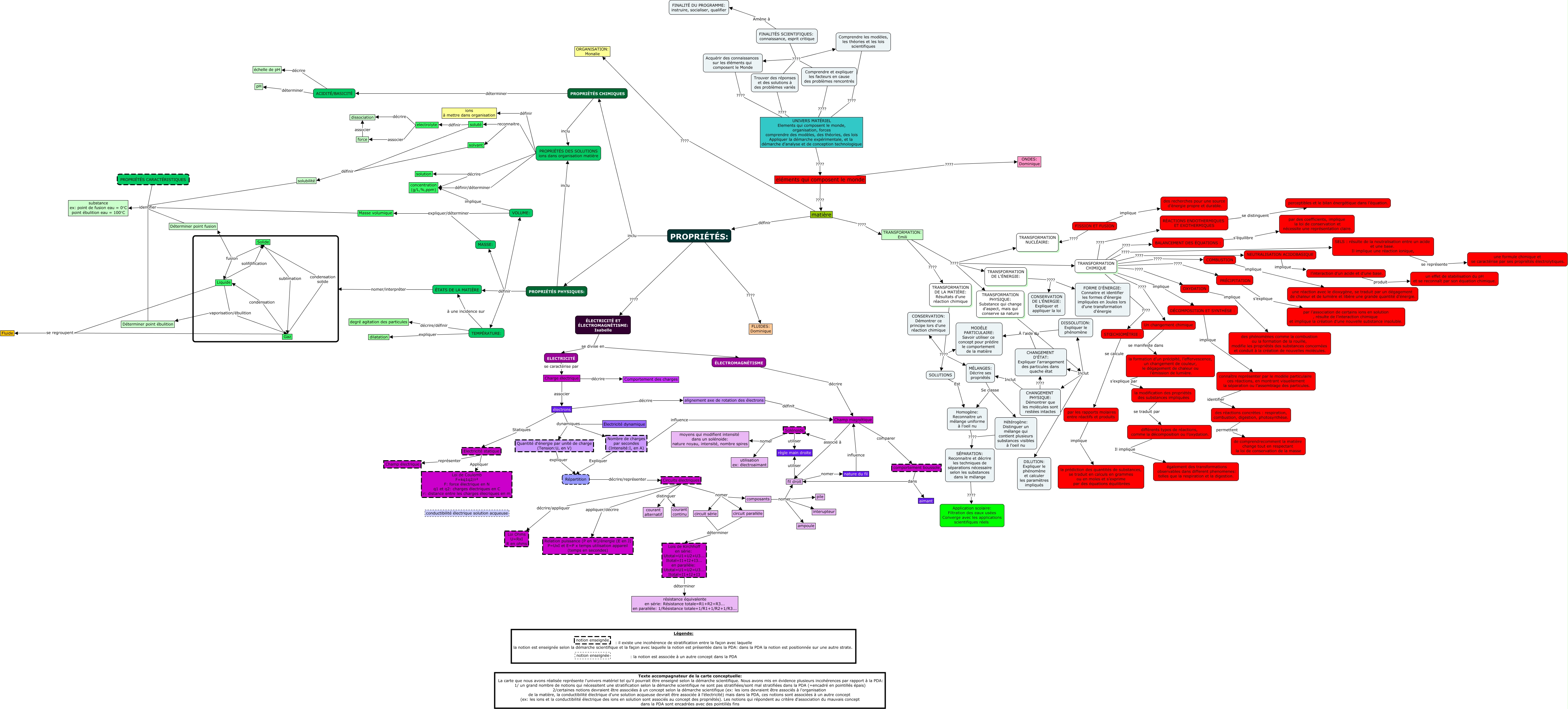 Cette carte de concepts créée avec IHMC CmapTools traite de: Équipe I carte à utiliser Isabelle, TRANSFORMATION: Emili ???? TRANSFORMATION DE LA MATIÈRE: Résultats d'une réaction chimique, Électricité dynamique dynamiques Nombre de charges par secondes (Intensité:I, en A), FINALITÉS SCIENTIFIQUES: connaissance, esprit critique ???? Trouver des réponses et des solutions à des problèmes variés, ACIDITÉ/BASICITÉ déterminer pH, composants nomer fil droit, TRANSFORMATION CHIMIQUE ???? OXYDATION, ÉLECTRICITÉ ET ÉLECTROMAGNÉTISME: Isabelle se divise en ÉLECTROMAGNÉTISME, ÉLECTROMAGNÉTISME décrire Champ magnétique, connaître représenter par le modèle particulaire ces réactions, en montrant visuellement la séparation ou l’assemblage des particules. identifier des réactions concrètes : respiration, combustion, digestion, photosynthèse., Liquide solifdification Solide, DISSOLUTION: Expliquer le phénomène À l'aide du MODÈLE PARTICULAIRE: Savoir utiliser ce concept pour prédire le comportement de la matière, TRANSFORMATION: Emili ???? TRANSFORMATION DE L'ÉNERGIE:, Répartition décrire/représenter Circuits électriques, eléments qui composent le monde ???? ONDES: Dominique, alignement axe de rotation des électrons définit Champ magnétique, TRANSFORMATION PHYSIQUE: Substance qui change d'aspect, mais qui conserve sa nature Inclut CHANGEMENT PHYSIQUE: Démontrer que les molécules sont restées intactes, TEMPÉRATURE: expliquer dilatation, circuit parallèle déterminer Lois de Kirchhoff en série: Utotal=U1+U2+U3... Itotal=I1+I2+I3... en parallèle: Utotal=U1=U2=U3... Itotal=I1+I2+I3, Trouver des réponses et des solutions à des problèmes variés ???? UNIVERS MATÉRIEL Elements qui composent le monde, organisation, forces comprendre des modèles, des théories, des lois Appliquer la démarche expérimentale, et la démarche d'analyse et de conception technologique, Acquérir des connaissances sur les éléments qui composent le Monde ???? UNIVERS MATÉRIEL Elements qui composent le monde, organisation, forces comprendre des modèles, des théories, des lois Appliquer la démarche expérimentale, et la démarche d'analyse et de conception technologique