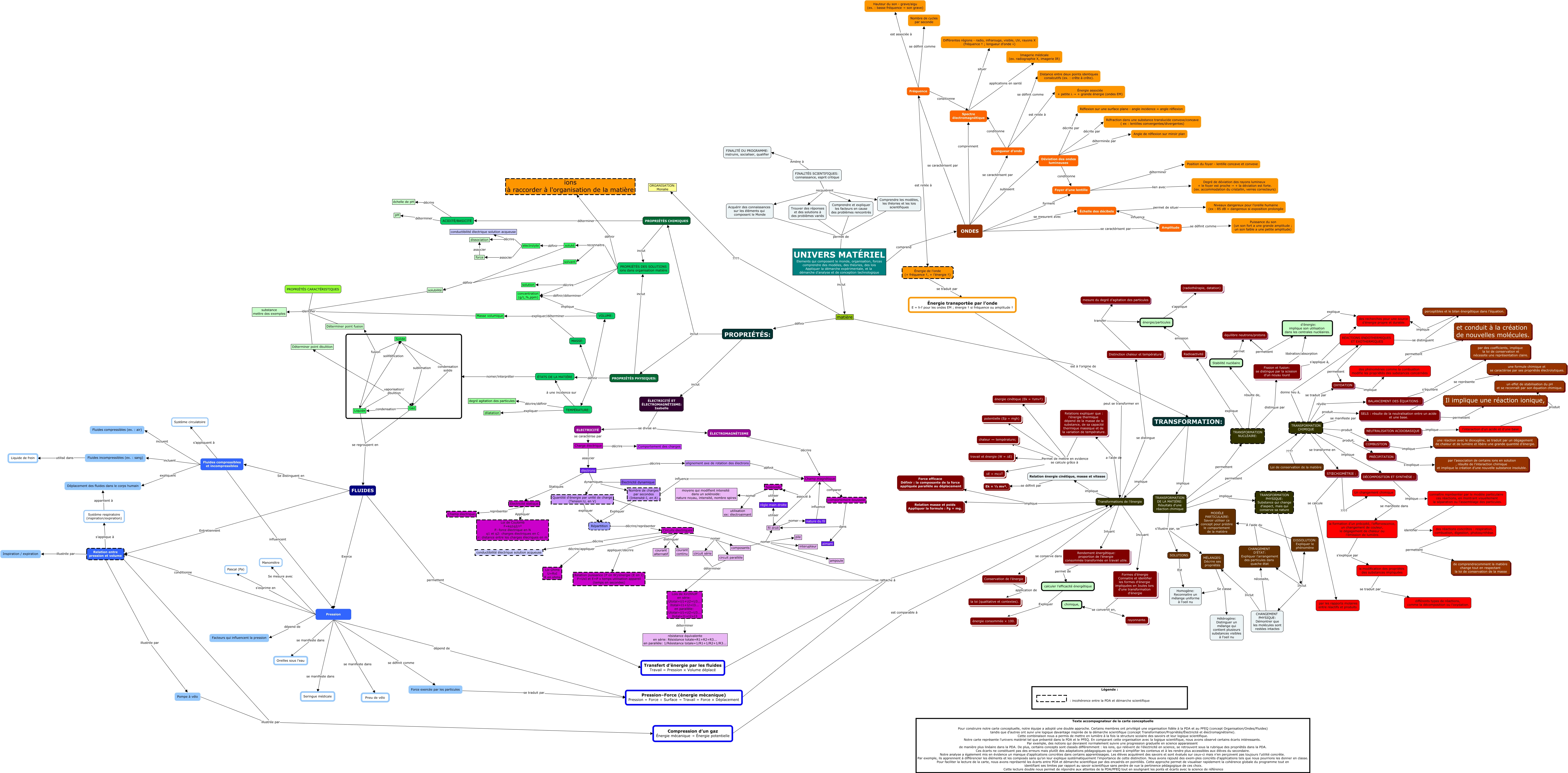 Cette carte de concepts créée avec IHMC CmapTools traite de: Équipe I carte finale à compléter par Monalie, ONDES se caractérisent par Longueur d’onde, Liquide vaporisation/ ébulition Gaz, Fluides compressibles et incompressibles incluent Fluides incompressibles (ex. : sang), Solide fusion Déterminer point fusion, VOLUME: implique concentration (g/L,%,ppm), énergie/particules s'applique (radiothérapie, datation), FLUIDES Exerce Pression, FINALITÉS SCIENTIFIQUES: connaissance, esprit critique recquièrent Trouver des réponses et des solutions à des problèmes variés, ÉTATS DE LA MATIÈRE nomer/interpréter, TRANSFORMATION CHIMIQUE ???? Loi de conservation de la matière, Comprendre les modèles, les théories et les lois scientifiques permet de UNIVERS MATÉRIEL Elements qui composent le monde, organisation, forces comprendre des modèles, des théories, des lois Appliquer la démarche expérimentale, et la démarche d'analyse et de conception technologique, Transformations de l’énergie Inluant Rendement énergétique: proportion de l’énergie consommée transformée en travail utile., PROPRIÉTÉS: inclut PROPRIÉTÉS CHIMIQUES, Déterminer point fusion identifier substance mettre des exemples, TRANSFORMATION DE LA MATIÈRE: Résultats d'une réaction chimique permettent TRANSFORMATION CHIMIQUE, BALANCEMENT DES ÉQUATIONS : s’équilibre par des coefficients, implique la loi de conservation et nécessite une représentation claire., COMBUSTION implique une réaction avec le dioxygène, se traduit par un dégagement de chaleur et de lumière et libère une grande quantité d’énergie., Circuits électriques décrire/appliquer Loi Ohms U=RxI R en ohms, ONDES se caractérisent par Amplitude, UNIVERS MATÉRIEL Elements qui composent le monde, organisation, forces comprendre des modèles, des théories, des lois Appliquer la démarche expérimentale, et la démarche d'analyse et de conception technologique comprend ONDES