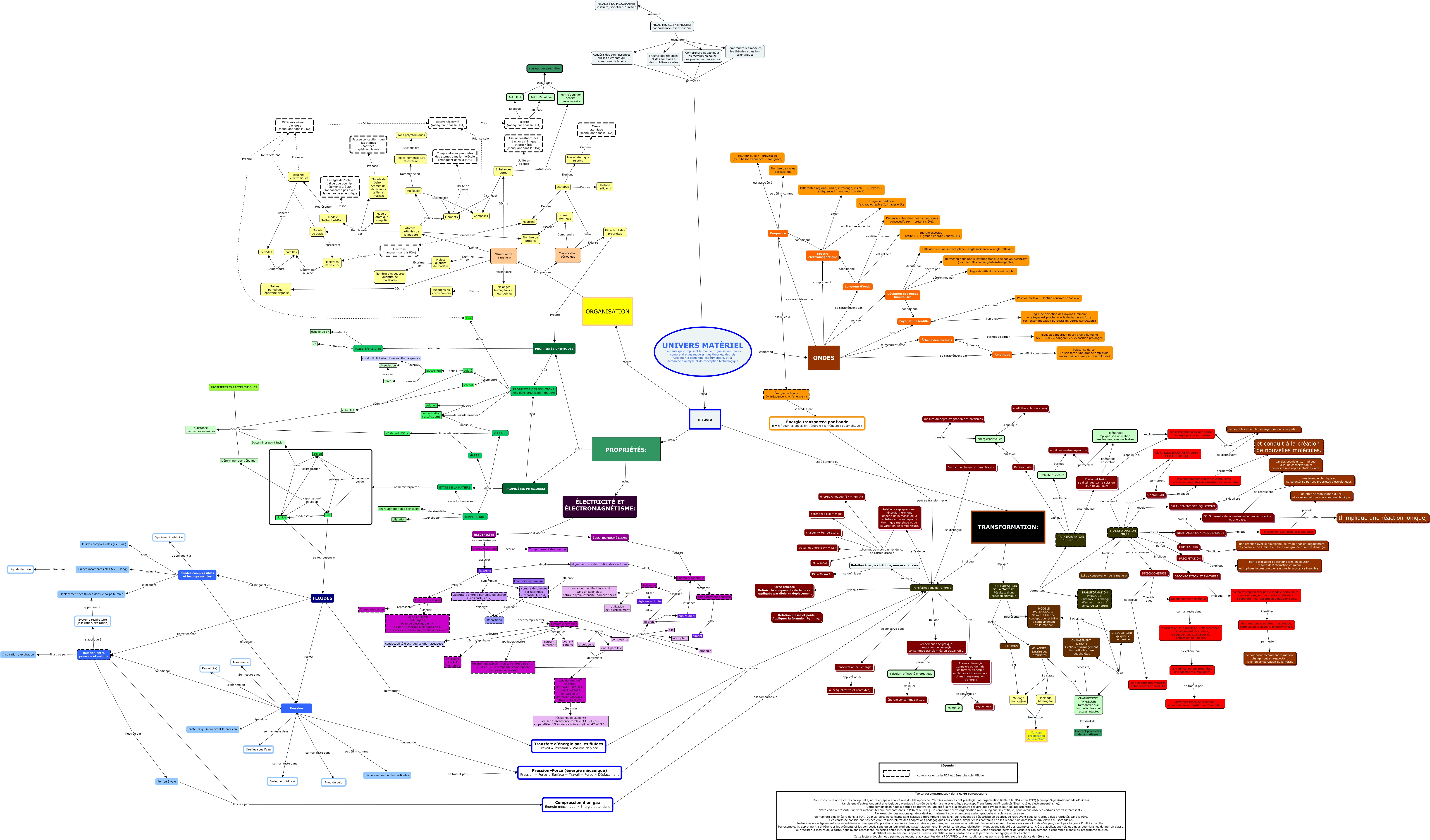 Cette carte de concepts créée avec IHMC CmapTools traite de: Équipe I carte finale (04-10-25), TRANSFORMATION DE LA MATIÈRE: Résultats d'une réaction chimique Représenter MODÈLE PARTICULAIRE: Savoir utiliser ce concept pour prédire le comportement de la matière, Fission et fusion: se distingue par la scission d’un noyau lourd libération/ absorption d’énergie: implique son utilisation dans les centrales nucléaires., TRANSFORMATION CHIMIQUE donne lieu à RÉACTIONS ENDOTHERMIQUES ET EXOTHERMIQUES, CHANGEMENT PHYSIQUE: Démontrer que les molécules sont restées intactes Inclut MÉLANGES: Décrire ses propriétés, Fréquence se définit comme Nombre de cycles par seconde, Tableau périodique: Répertoire organisé Comprendre Périodes, Modèle de Lewis Ne réflète pas Différents niveaux d'énergie (manquant dans la PDA), ACIDITÉ/BASICITÉ déterminer pH, NEUTRALISATION ACIDOBASIQUE implique l’interaction d’un acide et d’une base., PROPRIÉTÉS PHYSIQUES: définir VOLUME:, Longueur d’onde est reliée à Énergie associée + petite λ → + grande énergie (ondes EM), couches électroniques Repérer avec Périodes, PROPRIÉTÉS CARACTÉRISTIQUES identifier substance mettre des exemples, Modèle Rutherford-Borhr Utilise La règle de l'octet: Valide que pour les éléments 1 à 20. Ne concorde pas avec la démarche sciientifique, nature du fil influence Champ magnétique, DISSOLUTION: Expliquer le phénomène À l'aide du MODÈLE PARTICULAIRE: Savoir utiliser ce concept pour prédire le comportement de la matière, matière Intègre ORGANISATION, couches électroniques Possède Différents niveaux d'énergie (manquant dans la PDA), Nombre de charges par secondes (Intensité:I, en A) influence Champ magnétique, Atomes: particules de la matière Définir Éléments