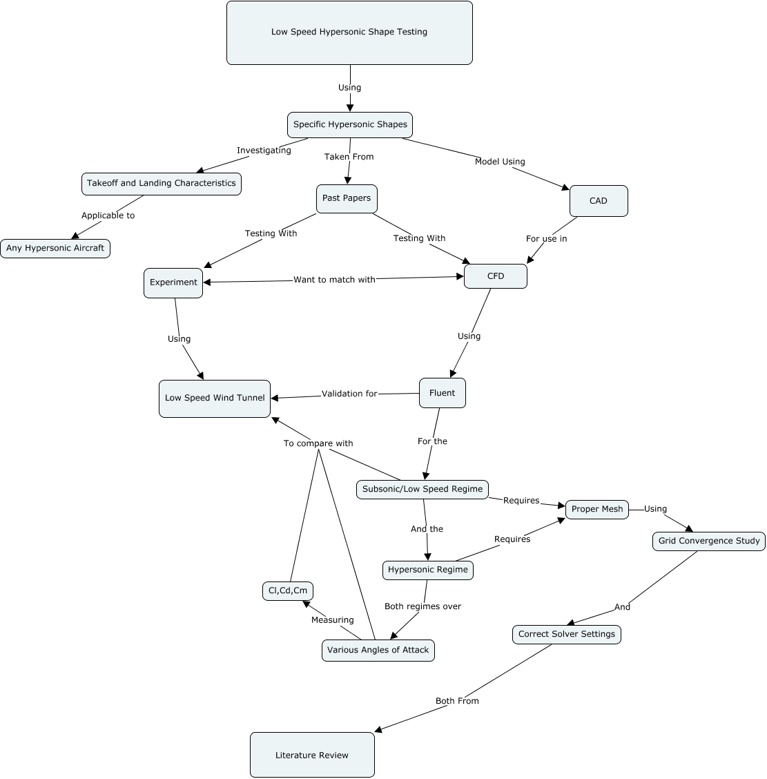 This Concept Map, created with IHMC CmapTools, has information related to: why, Low Speed Hypersonic Shape Testing Using Specific Hypersonic Shapes, Hypersonic Regime Requires Proper Mesh, Hypersonic Regime Both regimes over Various Angles of Attack, Grid Convergence Study And Correct Solver Settings, Specific Hypersonic Shapes Model Using CAD, Specific Hypersonic Shapes Investigating Takeoff and Landing Characteristics, CAD For use in CFD, Subsonic/Low Speed Regime And the Hypersonic Regime, Correct Solver Settings Both From Literature Review, Various Angles of Attack To compare with Low Speed Wind Tunnel, Past Papers Testing With Experiment, Specific Hypersonic Shapes Taken From Past Papers, CFD Using Fluent, Fluent Validation for Low Speed Wind Tunnel, Past Papers Testing With CFD, Takeoff and Landing Characteristics Applicable to Any Hypersonic Aircraft, Fluent For the Subsonic/Low Speed Regime, Various Angles of Attack Measuring Cl,Cd,Cm, Subsonic/Low Speed Regime To compare with Low Speed Wind Tunnel, Proper Mesh Using Grid Convergence Study
