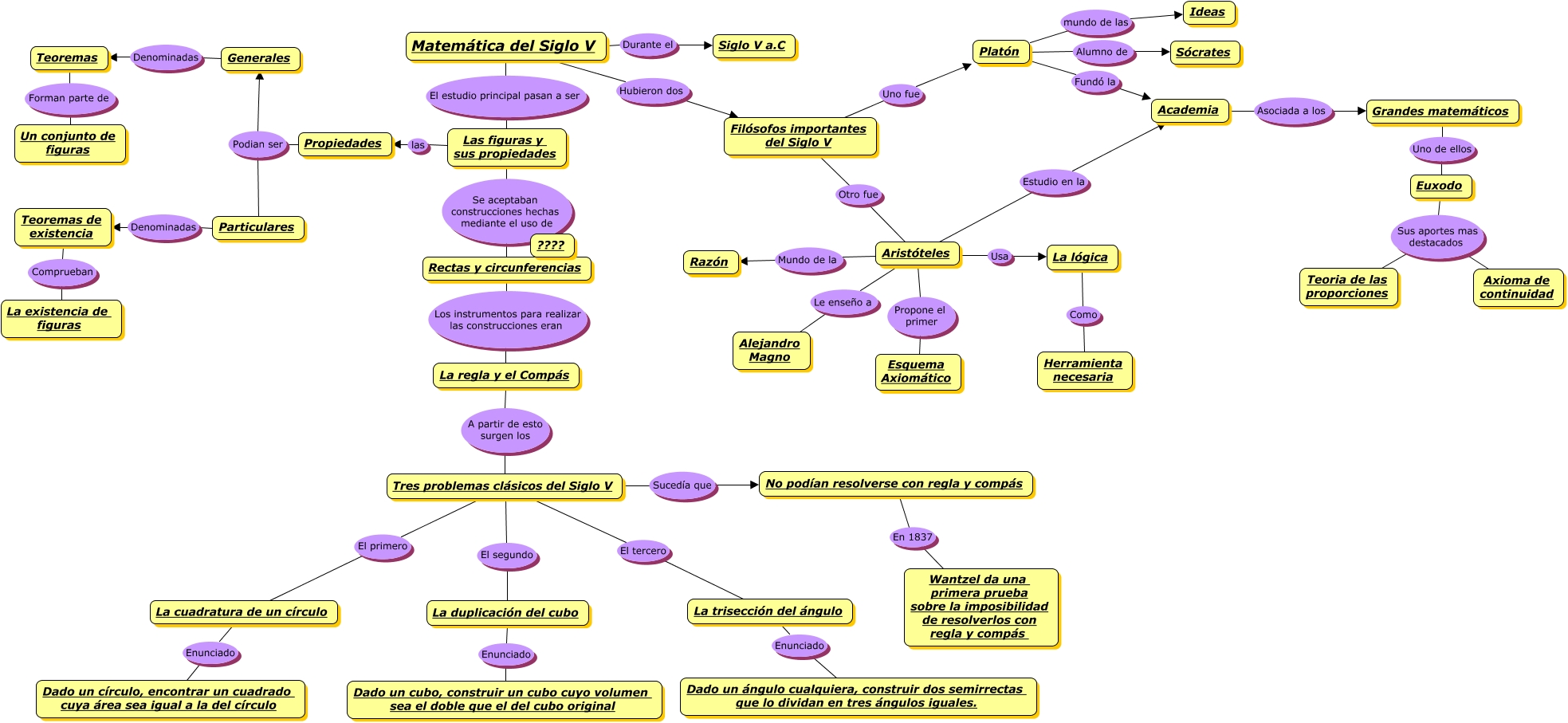 Este Cmap, tiene información relacionada con: Matemática del siglo V, Euxodo Sus aportes mas destacados Teoria de las proporciones, La regla y el Compás A partir de esto surgen los Tres problemas clásicos del Siglo V, Rectas y circunferencias Los instrumentos para realizar las construcciones eran La regla y el Compás, La lógica Como Herramienta necesaria, Filósofos importantes del Siglo V Uno fue Platón, Teoremas Forman parte de Un conjunto de figuras, Academia Asociada a los Grandes matemáticos, Tres problemas clásicos del Siglo V El primero La cuadratura de un círculo, Las figuras y sus propiedades Se aceptaban construcciones hechas mediante el uso de Rectas y circunferencias, Generales Denominadas Teoremas, Tres problemas clásicos del Siglo V Sucedía que No podían resolverse con regla y compás, Aristóteles Usa La lógica, Platón Fundó la Academia, Particulares Denominadas Teoremas de existencia, Matemática del Siglo V Durante el Siglo V a.C, Propiedades Podian ser Particulares, Aristóteles Le enseño a Alejandro Magno, Teoremas de existencia Comprueban La existencia de figuras, Aristóteles Estudio en la Academia, Filósofos importantes del Siglo V Otro fue Aristóteles