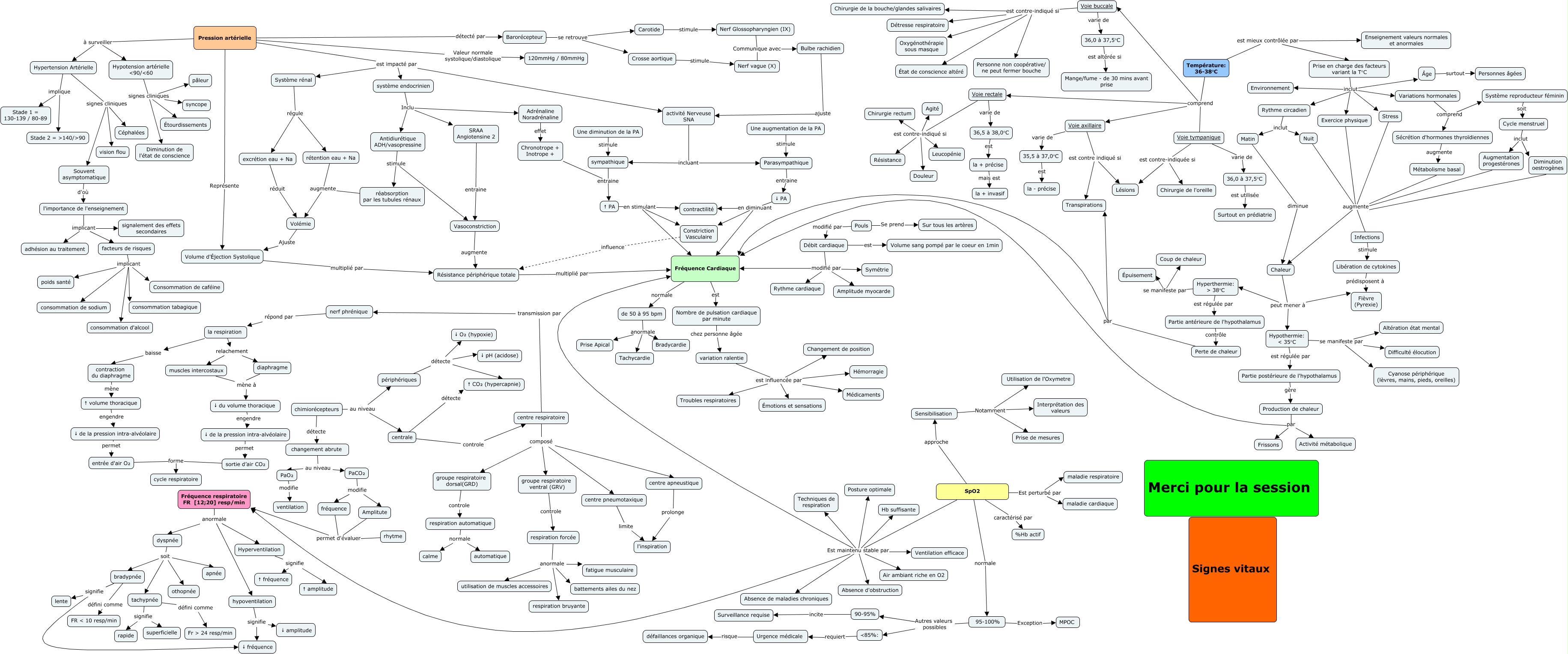 Cette carte de concepts créée avec IHMC CmapTools traite de: Signes Vitaux, changement abrute au niveau PaCO₂, 36,0 à 37,5°C est altérée si Mange/fume - de 30 mins avant prise, de 50 à 95 bpm anormale Tachycardie, Débit cardiaque modifié par Amplitude myocarde, Chronotrope + Inotrope + entraine ↑ PA, Sécrétion d'hormones thyroïdiennes augmente Métabolisme basal, Hypothermie: < 35°C se manifeste par Altération état mental, périphériques détecte ↓ O₂ (hypoxie), 95-100% Exception MPOC, Adrénaline Noradrénaline effet Chronotrope + Inotrope +, Hypertension Artérielle implique Stade 1 = 130-139 / 80-89, Système reproducteur féminin soit Cycle menstruel, Fréquence Cardiaque est Nombre de pulsation cardiaque par minute, Hyperthermie: > 38°C se manifeste par Coup de chaleur, fréquence permet d'évaluer Fréquence respiratoire FR [12;20] resp/min, facteurs de risques implicant consommation de sodium, Hypothermie: < 35°C se manifeste par Cyanose périphérique (lèvres, mains, pieds, oreilles), tachypnée signifie superficielle, variation ralentie est influencée par Changement de position, Voie rectale est contre-indiqué si Agité