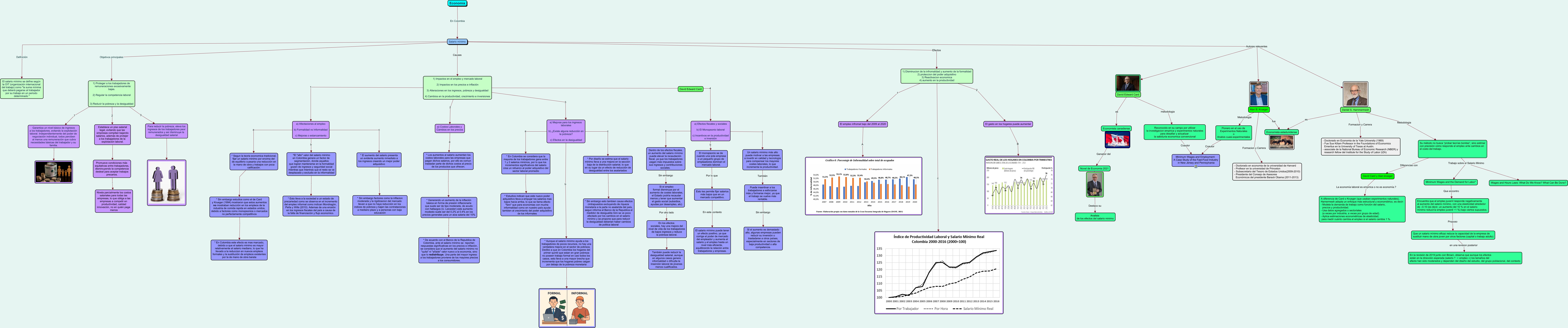 Este Cmap, tiene información relacionada con: Salario Minimo, Salario mínimo Causas 1) Impactos en el empleo y mercado laboral 2) Impactos en los precios e inflación 3) Alteraciones en los ingresos, pobreza y desigualdad 4) Cambios en la productividad, crecimiento e inversiones, 1) Disminucion de la infromalidad y aumento de la formalidad 2) proteccion del poder adquisitivo 3) Reactivacion economica 4) aumento en la productividad 2 El gasto en los hogares puede aumentar, 1) Impactos en el empleo y mercado laboral 2) Impactos en los precios e inflación 3) Alteraciones en los ingresos, pobreza y desigualdad 4) Cambios en la productividad, crecimiento e inversiones 3 a) Mejoras para los ingresos laborales b) ¿Existe alguna reducción en la pobreza? c) Efectos en la desigualdad, Daniel S. Hammermesh Metodologia Su método no busca “probar teorías bonitas”, sino estimar con precisión cómo responde el empleo ante cambios en el costo del trabajo., Daniel S. Hammermesh es Economista estadunidense, Para reducir la pobreza, eleva los ingresos de los trabajadores peor remunerados y así disminuye la desigualdad salarial -, a) Afectaciones al empleo b) Formalidad vs Informalidad c) Mejoras o estancamiento a * Segun la teoria economica tradicional, fijar un salario minimo por encima del de equilibrio cuasaria una reducción en la mano de obra y trabajos con poca calificación., El empleo infromal bajo del 2009 al 2020 A, Minimum Wages and the Demand for Labor” Que encontro Encuentra que el empleo juvenil responde negativamente al aumento del salario mínimo, con una elasticidad alrededor de –0.10 (es decir, un aumento del 10 % en el salario mínimo reduciría empleo juvenil ~1 %) bajo ciertos supuestos., Economía En Colombia Salario mínimo, 1) Proteger a los trabajadores de remuneraciones excesivamente bajas. 2) Regular la competencia laboral 3) Reducir la pobreza y la desigualdad 2 Establece un piso salarial legal, evitando que las empresas compitan bajando salarios, además de protejer a los trabajadores de la explotación laboral., Su método no busca “probar teorías bonitas”, sino estimar con precisión cómo responde el empleo ante cambios en el costo del trabajo. Trabajo sobre el Salario Minimo Minimum Wages and the Demand for Labor”, Salario mínimo Autores relevantes, *El "alto" valor del salario minimo en Colombia genera un factor de segmentación, donde aquellos que logran mantenerse en la formalidad gozen de ingresos y seguridad social mientras que mientras que el resto se ve desplazado y excludio en la informalidad - * Esto lleva a la sociedad a un estado de precariedad como se observa en el incremento del empleo informal como indican Mondragón, Peña y Wills (2010). Ademas de una erosión en los ingresos fiscales del país a causa de la falta de financiación y flujo economico., Pionero en el uso de Experimentos Naturales o Analsis cuasi-experimentales Coautor Minimum Wages and Employment: A Case Study of the Fast-Food Industry in New Jersey and Pennsylvania, El monopsonio se da cuando una sola empresa o un pequeño grupo de empleadores dominan el mercado laboral. Por lo que Esto les permite fijar salarios más bajos que en un mercado competitivo., Encuentra que el empleo juvenil responde negativamente al aumento del salario mínimo, con una elasticidad alrededor de –0.10 (es decir, un aumento del 10 % en el salario mínimo reduciría empleo juvenil ~1 %) bajo ciertos supuestos. Propuso Que un salario mínimo eficaz reduce la capacidad de la empresa de sustituir mano de obra joven por otros factores (capital o trabajo adulto), a) Mejoras para los ingresos laborales b) ¿Existe alguna reducción en la pobreza? c) Efectos en la desigualdad c * Por diseño se estima que el salario minimo lleva a una mejora en la sección baja de la distribución salarial, lo que en su lugar da un efecto de reducción de desigualdad entre los asalariados, * Sin embargo estudios como el de Card y Krueger (1994) mostraron que estos aumentos no mostraban reducción en los empleos de la industria de comida rapida en estados unidos, debido a factores como monopsonios o mercados no perfectamente competitivos - * En Colombia este efecto es mas marcado, debido a que el salario minimo es mayor relativamente al salario mediano, lo que ha llevado a la reduccion en nuevos empleos formales y la sustitución de empleos existentes por la de mano de obra barata, Promueve condiciones más equitativas entre trabajadores, disminuyendo la competencia desleal para aceptar trabajos precarios. - Nivela parcialmente los costos salariales para todas las empresas, lo que obliga a las empresas a competir en productividad, calidad innovación, no en quién paga menos