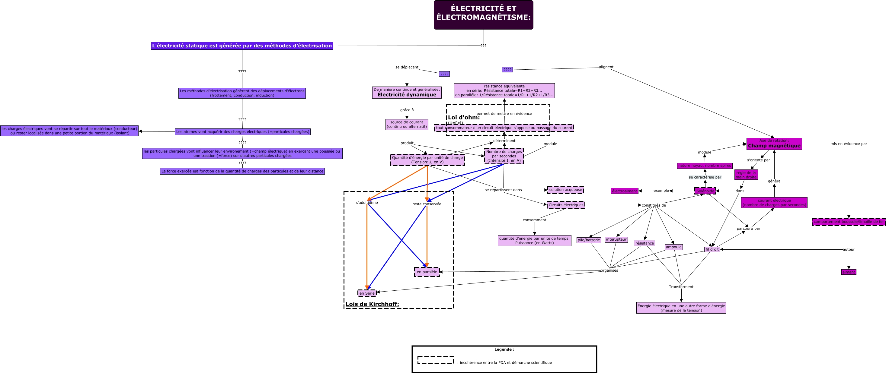 Cette carte de concepts créée avec IHMC CmapTools traite de: Équipe_T3_8_carte_sauvegarde_Isabelle_ne_pas_modifier2, comportement boussole/limaille de fer autour fil droit, Solénoide se caractérise par nature noyau, nombre spires, tout consommateur d'un circuit électrique s'oppose au passage du courant permet de mettre en évidence résistance équivalente en série: Résistance totale=R1+R2+R3... en paralléle: 1/Résistance totale=1/R1+1/R2+1/R3..., Nombre de charges par secondes (Intensité:I, en A) module Axe de rotation: Champ magnétique, fil droit parcouru par courant électrique (nombre de charges par secondes), Circuits électriques constitués de interupteur, Nombre de charges par secondes (Intensité:I, en A) reste conservée en paralèle, règle de la main droite dans Solénoide, interupteur organisés en paralèle, pile/batterie organisés en paralèle, Quantité d'énergie par unité de charge (Tension:U, en V) s'additionne en paralèle, interupteur organisés en Série, ???? se déplacent De manière continue et généralisée: Électricité dynamique, Circuits électriques constitués de fil droit, fil droit Transforment Énergie électrique en une autre forme d'énergie (mesure de la tension), résistance Transforment Énergie électrique en une autre forme d'énergie (mesure de la tension), Circuits électriques constitués de pile/batterie, Quantité d'énergie par unité de charge (Tension:U, en V) déterminent tout consommateur d'un circuit électrique s'oppose au passage du courant, Nombre de charges par secondes (Intensité:I, en A) reste conservée en Série, Circuits électriques constitués de résistance