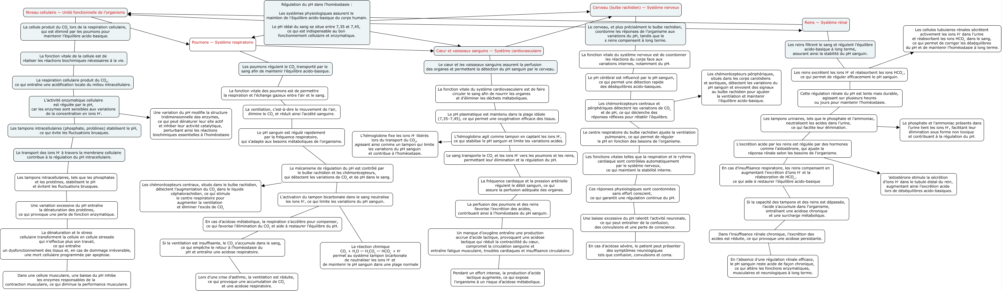 This Concept Map, created with IHMC CmapTools, has information related to: Partie Jennifer, La ventilation, c’est-à-dire le mouvement de l’air, élimine le CO₂ et réduit ainsi l’acidité sanguine. Le pH sanguin est régulé rapidement par la fréquence respiratoire, qui s’adapte aux besoins métaboliques de l’organisme., Cœur et vaisseaux sanguins — Système cardiovasculaire Le cœur et les vaisseaux sanguins assurent la perfusion des organes et permettent la détection du pH sanguin par le cerveau., L’hémoglobine agit comme tampon en captant les ions H⁺, ce qui stabilise le pH sanguin et limite les variations acides. Le sang transporte le CO₂ et les ions H⁺ vers les poumons et les reins, permettant leur élimination et la régulation du pH., Si la capacité des tampons et des reins est dépassée, l’acide s’accumule dans l’organisme, entraînant une acidose chronique et une surcharge métabolique. Dans l’insuffisance rénale chronique, l’excrétion des acides est réduite, ce qui provoque une acidose persistante., Le cerveau, et plus précisément le bulbe rachidien, coordonne les réponses de l’organisme aux variations du pH, tandis que le s reins compensent à long terme. La fonction vitale du système nerveux est de coordonner les réactions du corps face aux variations internes, notamment du pH., Les tampons intracellulaires, tels que les phosphates et les protéines, stabilisent le pH et évitent les fluctuations brusques. Une variation excessive du pH entraîne la dénaturation des protéines, ce qui provoque une perte de fonction enzymatique., Régulation du pH dans l’homéostasie : Les systèmes physiologiques assurent le maintien de l’équilibre acido-basique du corps humain. Le pH idéal du sang se situe entre 7,35 et 7,45, ce qui est indispensable au bon fonctionnement cellulaire et enzymatique. Cerveau (bulbe rachidien) — Système nerveux, Le transport des ions H⁺ à travers la membrane cellulaire contribue à la régulation du pH intracellulaire. Les tampons intracellulaires, tels que les phosphates et les protéines, stabilisent le pH et évitent les fluctuations brusques., L’activation du tampon bicarbonate dans le sang neutralise les ions H⁺, ce qui limite les variations du pH sanguin. La réaction chimique CO₂ + H₂O ⇌ H₂CO₃ ⇌ HCO₃⁻ + H⁺ permet au système tampon bicarbonate de neutraliser les ions H⁺ et de maintenir le pH sanguin dans une plage normale, Cœur et vaisseaux sanguins — Système cardiovasculaire Cerveau (bulbe rachidien) — Système nerveux, La fonction vitale du système cardiovasculaire est de faire circuler le sang afin de nourrir les organes et d’éliminer les déchets métaboliques. Le pH plasmatique est maintenu dans la plage idéale (7,35–7,45), ce qui permet une oxygénation efficace des tissus., Cerveau (bulbe rachidien) — Système nerveux Le cerveau, et plus précisément le bulbe rachidien, coordonne les réponses de l’organisme aux variations du pH, tandis que le s reins compensent à long terme., La perfusion des poumons et des reins favorise l’excrétion des acides, contribuant ainsi à l’homéostasie du pH sanguin. Un manque d’oxygène entraîne une production accrue d’acide lactique, provoquant une acidose lactique qui réduit la contractilité du cœur, compromet la circulation sanguine et entraîne fatigue musculaire, troubles cardiaques et insuffisance circulatoire., Le cœur et les vaisseaux sanguins assurent la perfusion des organes et permettent la détection du pH sanguin par le cerveau. La fonction vitale du système cardiovasculaire est de faire circuler le sang afin de nourrir les organes et d’éliminer les déchets métaboliques., Les poumons régulent le CO₂ transporté par le sang afin de maintenir l’équilibre acido-basique. La fonction vitale des poumons est de permettre la respiration et l’échange gazeux entre l’air et le sang., Le centre respiratoire du bulbe rachidien ajuste la ventilation pulmonaire, ce qui permet de réguler le pH en fonction des besoins de l’organisme. Les fonctions vitales telles que la respiration et le rythme cardiaque sont contrôlées automatiquement par le système nerveux, ce qui maintient la stabilité interne., La cellule produit du CO₂ lors de la respiration cellulaire, qui est éliminé par les poumons pour maintenir l’équilibre acido-basique. La fonction vitale de la cellule est de réaliser les réactions biochimiques nécessaires à la vie., Reins — Système rénal Les reins filtrent le sang et régulent l’équilibre acido-basique à long terme, assurant ainsi la stabilité du pH sanguin., La fréquence cardiaque et la pression artérielle régulent le débit sanguin, ce qui assure la perfusion adéquate des organes. La perfusion des poumons et des reins favorise l’excrétion des acides, contribuant ainsi à l’homéostasie du pH sanguin., Le pH cérébral est influencé par le pH sanguin, ce qui permet une détection rapide des déséquilibres acido-basiques. Les chémorécepteurs centraux et périphériques détectent les variations de CO₂ et de pH, ce qui déclenche des réponses réflexes pour rétablir l’équilibre.