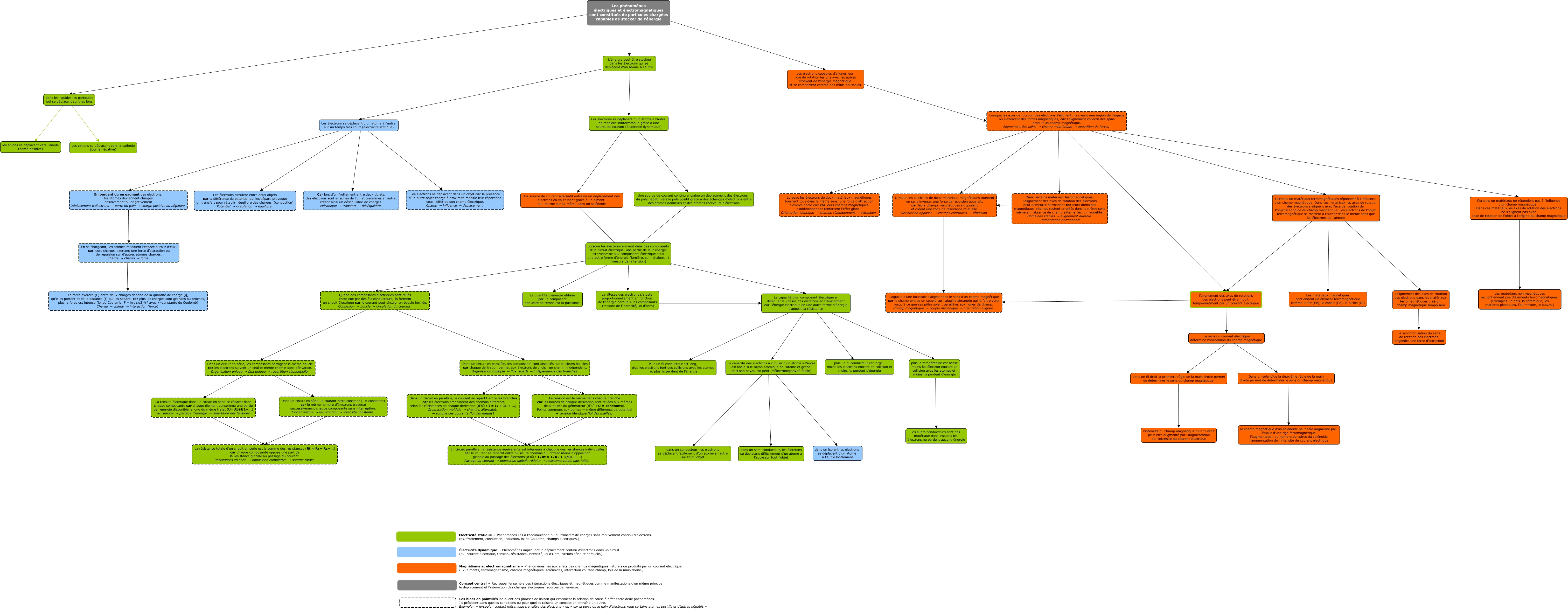 Cette carte de concepts créée avec IHMC CmapTools traite de: Équipe_T3_8_carte_corrections_IG_DOM27oct_2, plus la température est basse moins les électron entrent en collision avec les atomes et moins ils perdent d'énergie ???? les supra conducteurs sont des matériaux dans lesquels les électrons ne perdent aucune énergie, La capacité des électrons à circuler d'un atome à l'autre est facile si le rayon atomique de l'atome et grand et si son noyau est petit (=électronégativité faible) ???? dans un isolant les électrons se déplacent d'un atome à l'autre localement, Les électrons se déplacent d'un atome à l'autre sur un temps très court (électricité statique) ???? Les électrons se déplacent dans un objet car la présence d’un autre objet chargé à proximité modifie leur répartition sous l’effet de son champ électrique. Champ → influence → déplacement, l'alignement des axes de rotations des électrons peut être induit temporairement par un courant électrique Le sens du courant électrique détermine l'orientation du champ magnétique Dans un solénoïde la deuxième règle de la main droite permet de déterminer le sens du champ magnétique, Dans un circuit en série, le courant reste constant (I = constante) car le même nombre d’électrons traverse successivement chaque composante sans interruption. Circuit unique → flux continu → intensité constante ???? La résistance totale d’un circuit en série est la somme des résistances (Rt = R₁+ R₂+...) car chaque composante oppose une part de la résistance globale au passage du courant. Résistances en série → opposition cumulative → somme totale, Lorsque les électrons de deux matériaux magnétiques tournent en sens inverse, une force de répulsion apparaît, car leurs champs magnétiques s’opposent et créent une zone de résistance mutuelle. Orientation opposée → champs contraires → répulsion ???? L’aiguille d’une boussole s’aligne dans le sens d’un champ magnétique car le champ exerce un couple sur l’aiguille aimantée qui la fait pivoter jusqu’à ce que ses pôles soient parallèles aux lignes de champ. Champ magnétique → couple mécanique → orientation alignée, dans les liquides les particules qui se déplacent sont les ions ???? Les cations se déplacent vers la cathode (borne négative), Les électrons se déplacent d'un atome à l'autre de manière ininterrompue grâce à une source de courant (électricité dynamique) Une source de courant alternatif entraine un déplacement des électrons en va et vient grâce à un aimant qui tourne sur lui même dans un solénoïde, Les phénomènes électriques et électromagnétiques sont constitués de particules chargées capables de stocker de l'énergie ???? dans les liquides les particules qui se déplacent sont les ions, Lorsque les axes de rotation des électrons s’alignent, ils créent une région de l’espace où s’exercent des forces magnétiques, car l’alignement collectif des spins produit un champ magnétique. Alignement des spins → champ magnétique → apparition de forces ???? Lorsque les électrons de deux matériaux magnétiques tournent en sens inverse, une force de répulsion apparaît, car leurs champs magnétiques s’opposent et créent une zone de résistance mutuelle. Orientation opposée → champs contraires → répulsion, La tension est la même dans chaque branche car les bornes de chaque dérivation sont reliées aux mêmes deux points du générateur (d’où : U = constante). Points communs aux bornes → même différence de potentiel → tension identique (loi des mailles) ???? En circuit parallèle, la résistance équivalente est inférieure à chacune des résistances individuelles car le courant se répartit entre plusieurs chemins qui offrent moins d’opposition globale au passage des électrons (d’où : 1/Rt = 1/R₁ + 1/R₂ + …) Partage du courant → opposition globale réduite → résistance totale plus faible, Certains un matériaux ferromagnétiques répondent à l'influence d'un champ magnétique. Dans ces matériaux les axes de rotation des électrons s'alignent avec l'axe de rotation de l'objet à l'origine du champ magnétique. Les électrons de l'objet ferromagnétique se mettent à tourner dans le même sens que les électrons de l'aimant ???? l'alignement des axes de rotations des électrons peut être induit temporairement par un courant électrique, Lorsque les électrons arrivent dans des composants d'un circuit électrique, une partie de leur énergie est transmise aux composants électrique sous une autre forme d'énergie (lumière, son, chaleur...) (mesure de la tension) ???? La capacité d'un composant électrique à diminuer la vitesse des électrons en transformant leur l'énergie électrique en une autre forme d'énergie s'appelle la résistance, La capacité des électrons à circuler d'un atome à l'autre est facile si le rayon atomique de l'atome et grand et si son noyau est petit (=électronégativité faible) ???? dans un semi conducteur, les électrons se déplacent difficilement d'un atome à l'autre sur tout l'objet, Les phénomènes électriques et électromagnétiques sont constitués de particules chargées capables de stocker de l'énergie ???? Les électrons capables d'aligner leur axe de rotation les uns avec les autres stockent de l'énergie magnétique et se comportent comme des minis boussoles, La tension électrique dans un circuit en série se répartit dans chaque composante car chaque élément consomme une partie de l’énergie disponible le long du même trajet (U=U1+U2+...) Flux unique → partage d’énergie → répartition des tensions ???? La résistance totale d’un circuit en série est la somme des résistances (Rt = R₁+ R₂+...) car chaque composante oppose une part de la résistance globale au passage du courant. Résistances en série → opposition cumulative → somme totale, l'alignement des