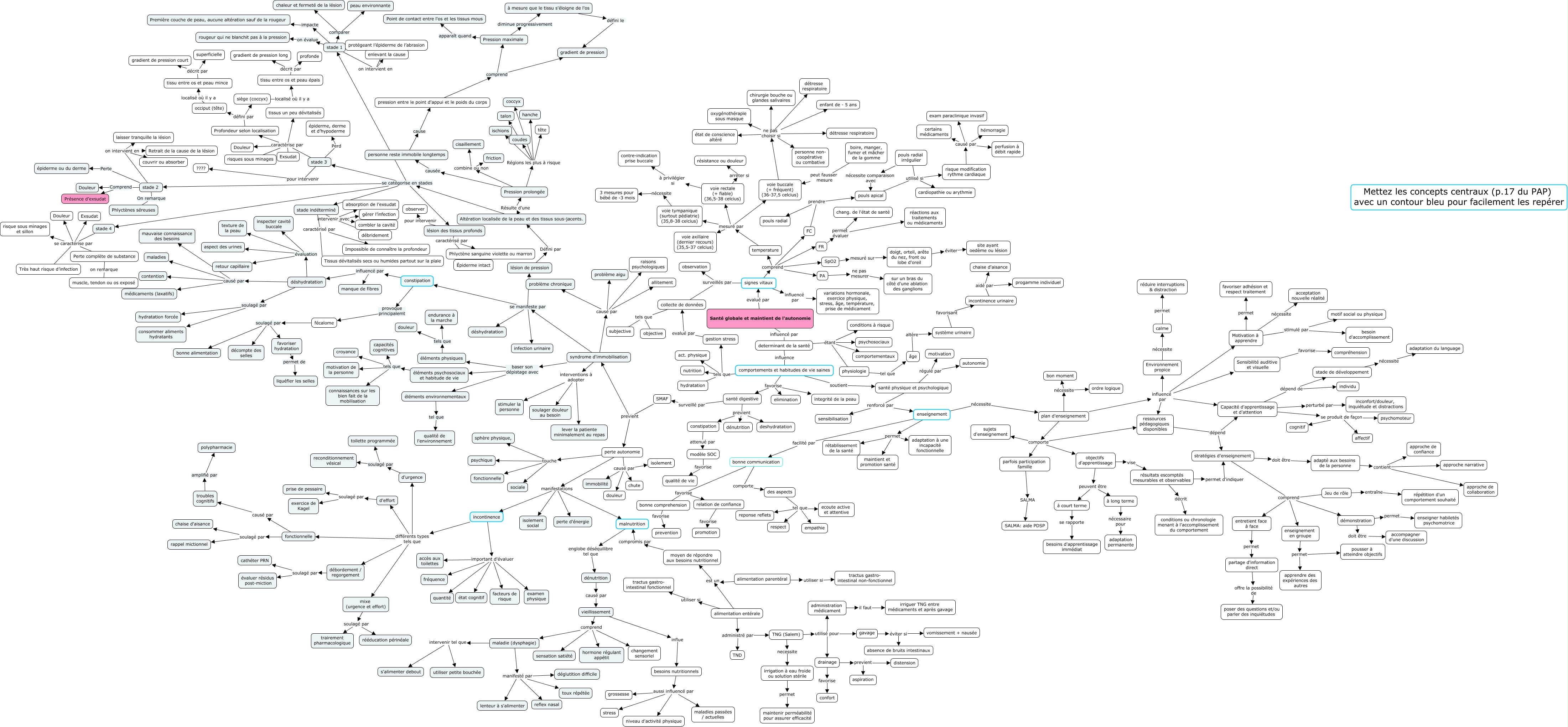 Cette carte de concepts créée avec IHMC CmapTools traite de: Schema integratrice, comportements et habitudes de vie saines favorise elimination, adapté aux besoins de la personne contient approche de confiance, stade 4 se caractérise par risque sous minages et sillon, pression entre le point d'appui et le poids du corps comprend Pression maximale, syndrome d'immobilisation se manifeste par infection urinaire, Capacité d'apprentissage et d'attention perturbé par inconfort/douleur, inquiétude et distractions, signes vitaux surveillés par collecte de données, alimentation entérale administré par TNG (Salem), voie buccale (+ fréquent) (36-37,5 celcius) ne pas choisir si oxygénothérapie sous masque, Motivation à apprendre permet favoriser adhésion et respect traitement, fonctionnelle soulagé par rappel mictionnel, objectifs d'apprentissage peuvent être à long terme, incontinence important d'évaluer examen physique, tissu entre os et peau épais décrit par profonde, Pression prolongée combine ou non cisaillement, des aspects tel que respect, voie buccale (+ fréquent) (36-37,5 celcius) ne pas choisir si enfant de - 5 ans, FC prendre pouls radial, entretient face à face permet partage d'information direct, Perte complète de substance on remarque muscle, tendon ou os exposé