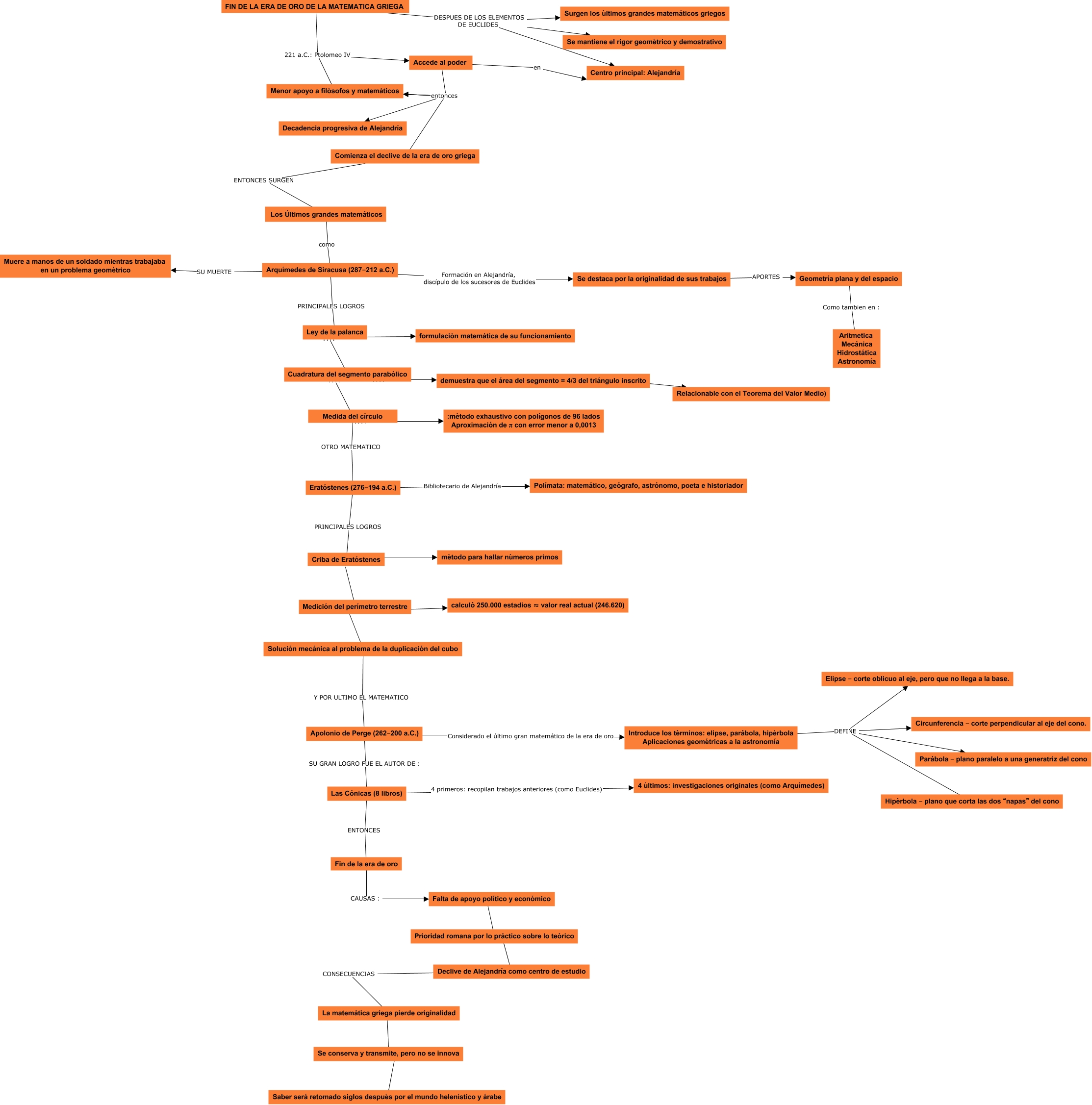 Este Cmap, tiene información relacionada con: FIN DE LA ERA DE ORO DE LA MATEMATICA GRIEGA, FIN DE LA ERA DE ORO DE LA MATEMATICA GRIEGA DESPUES DE LOS ELEMENTOS DE EUCLIDES Surgen los últimos grandes matemáticos griegos, Se destaca por la originalidad de sus trabajos APORTES Geometría plana y del espacio, FIN DE LA ERA DE ORO DE LA MATEMATICA GRIEGA DESPUES DE LOS ELEMENTOS DE EUCLIDES Centro principal: Alejandría, FIN DE LA ERA DE ORO DE LA MATEMATICA GRIEGA 221 a.C.: Ptolomeo IV Accede al poder, Cuadratura del segmento parabólico ???? demuestra que el área del segmento = 4/3 del triángulo inscrito, Falta de apoyo político y económico ???? Prioridad romana por lo práctico sobre lo teórico, Eratóstenes (276–194 a.C.) PRINCIPALES LOGROS Criba de Eratóstenes, Criba de Eratóstenes ???? método para hallar números primos, Accede al poder en Centro principal: Alejandría, Medida del círculo OTRO MATEMATICO Eratóstenes (276–194 a.C.), Medición del perímetro terrestre ???? Solución mecánica al problema de la duplicación del cubo, Arquímedes de Siracusa (287–212 a.C.) SU MUERTE Muere a manos de un soldado mientras trabajaba en un problema geométrico, demuestra que el área del segmento = 4/3 del triángulo inscrito ???? Relacionable con el Teorema del Valor Medio), Solución mecánica al problema de la duplicación del cubo Y POR ULTIMO EL MATEMATICO Apolonio de Perge (262–200 a.C.), Declive de Alejandría como centro de estudio CONSECUENCIAS La matemática griega pierde originalidad, Ley de la palanca ???? Cuadratura del segmento parabólico, Accede al poder entonces Comienza el declive de la era de oro griega, Las Cónicas (8 libros) ENTONCES Fin de la era de oro, Arquímedes de Siracusa (287–212 a.C.) PRINCIPALES LOGROS Ley de la palanca, Introduce los términos: elipse, parábola, hipérbola Aplicaciones geométricas a la astronomía DEFINE Elipse – corte oblicuo al eje, pero que no llega a la base.
