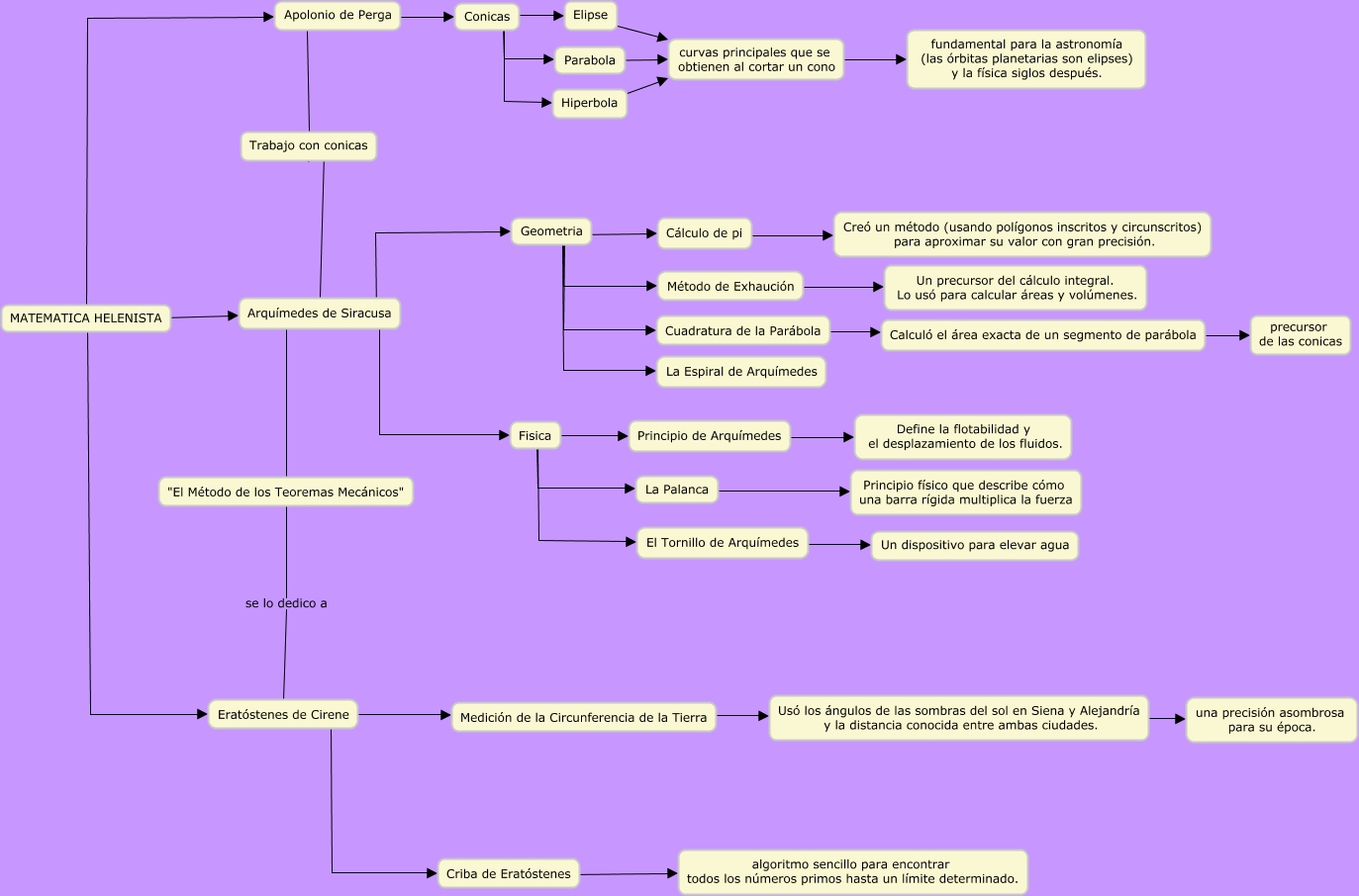 Este Cmap, tiene información relacionada con: ERA DE ORO, El Tornillo de Arquímedes ???? Un dispositivo para elevar agua, Arquímedes de Siracusa ???? "El Método de los Teoremas Mecánicos", Usó los ángulos de las sombras del sol en Siena y Alejandría y la distancia conocida entre ambas ciudades. ???? una precisión asombrosa para su época., Eratóstenes de Cirene ???? Criba de Eratóstenes, Cuadratura de la Parábola ???? Calculó el área exacta de un segmento de parábola, Fisica ???? La Palanca, Geometria ???? Cuadratura de la Parábola, Hiperbola ???? curvas principales que se obtienen al cortar un cono, La Palanca ???? Principio físico que describe cómo una barra rígida multiplica la fuerza, Conicas ???? Hiperbola, Arquímedes de Siracusa ???? Trabajo con conicas, Fisica ???? Principio de Arquímedes, Eratóstenes de Cirene ???? Medición de la Circunferencia de la Tierra, Apolonio de Perga ???? Trabajo con conicas, Conicas ???? Elipse, Apolonio de Perga ???? Conicas, Principio de Arquímedes ???? Define la flotabilidad y el desplazamiento de los fluidos., Calculó el área exacta de un segmento de parábola ???? precursor de las conicas, Conicas ???? Parabola, Medición de la Circunferencia de la Tierra ???? Usó los ángulos de las sombras del sol en Siena y Alejandría y la distancia conocida entre ambas ciudades.