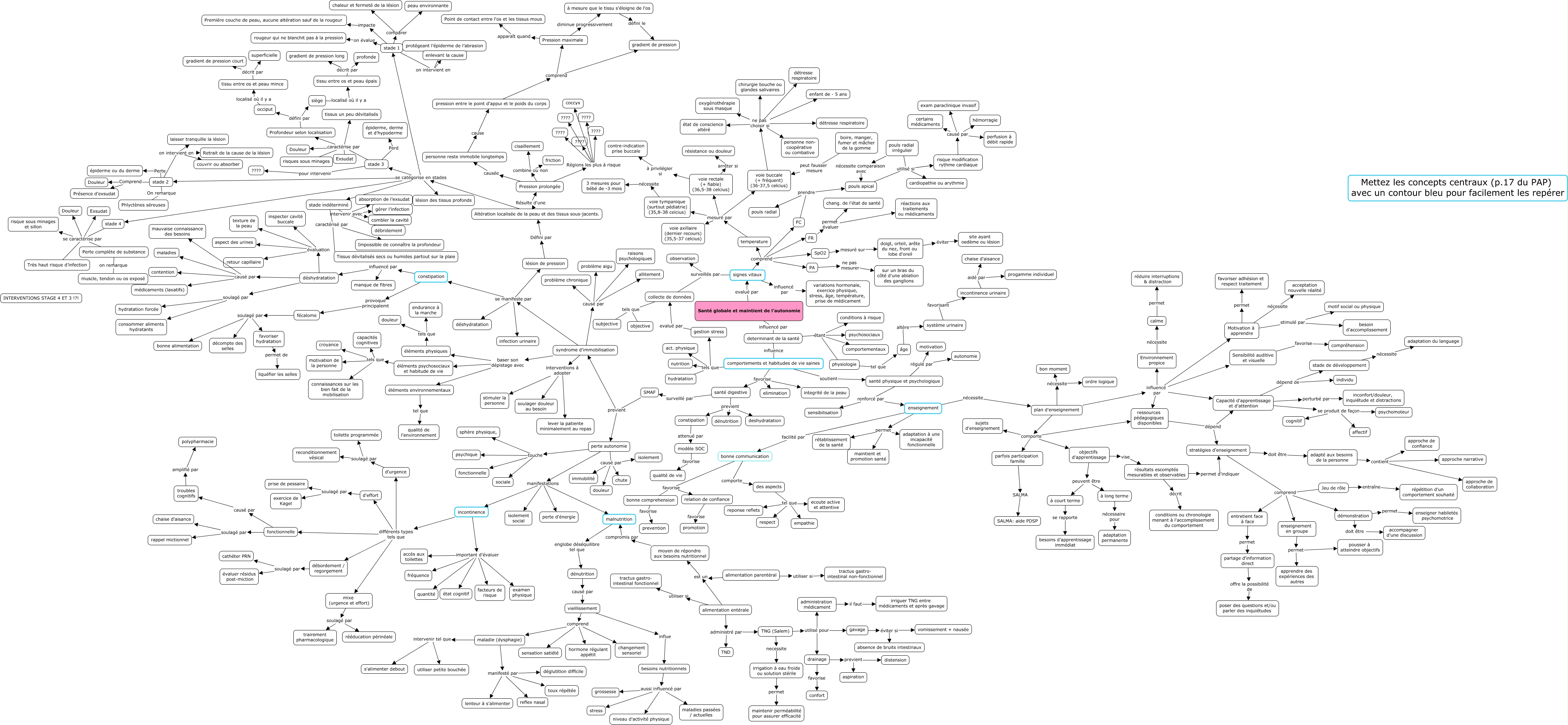 Cette carte de concepts créée avec IHMC CmapTools traite de: intégrateur 2, incontinence différents types tels que d'effort, Environnement propice nécessite calme, comportements et habitudes de vie saines favorise santé digestive, stade indéterminé intervenir avec absorption de l’exsudat, Altération localisée de la peau et des tissus sous-jacents. se catégorise en stades stade indéterminé, FC prendre pouls radial, signes vitaux surveillés par observation, administration médicament il faut irriguer TNG entre médicaments et après gavage, incontinence différents types tels que mixe (urgence et effort), entretient face à face permet partage d'information direct, doigt, orteil, arête du nez, front ou lobe d'oreil éviter site ayant oedème ou lésion, voie rectale (+ fiable) (36,5-38 celcius) arrêter si résistance ou douleur, occiput localisé où il y a tissu entre os et peau mince, incontinence différents types tels que fonctionnelle, syndrome d'immobilisation se manifeste par lésion de pression, déshydratation soulagé par consommer aliments hydratants, physiologie tel que âge, perte autonomie causé par douleur, incontinence urinaire aidé par chaise d'aisance, stade indéterminé caractérisé par Impossible de connaître la profondeur