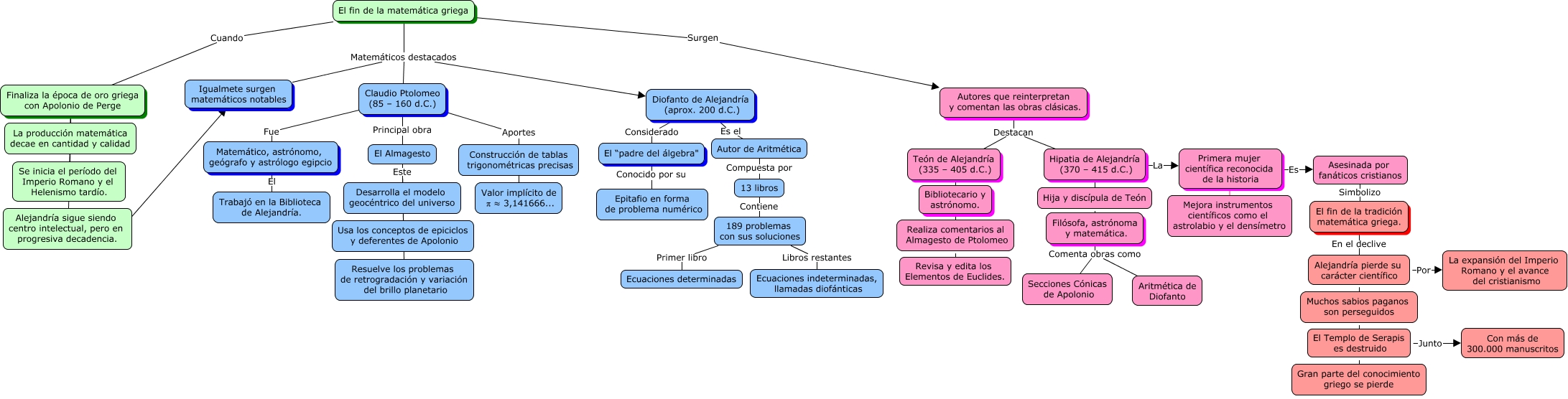 Este Cmap, tiene información relacionada con: El fin de la matemática griega, Teón de Alejandría (335 – 405 d.C.) ???? Bibliotecario y astrónomo., Autor de Aritmética Compuesta por 13 libros, El fin de la tradición matemática griega. En el declive Muchos sabios paganos son perseguidos, Claudio Ptolomeo (85 – 160 d.C.) Aportes Valor implícito de π ≈ 3,141666..., Primera mujer científica reconocida de la historia Mejora instrumentos científicos como el astrolabio y el densímetro, Diofanto de Alejandría (aprox. 200 d.C.) Es el Autor de Aritmética, Finaliza la época de oro griega con Apolonio de Perge ???? La producción matemática decae en cantidad y calidad, El fin de la tradición matemática griega. En el declive Gran parte del conocimiento griego se pierde, Autores que reinterpretan y comentan las obras clásicas. Destacan Teón de Alejandría (335 – 405 d.C.), Hipatia de Alejandría (370 – 415 d.C.) ???? Hija y discípula de Teón, Hipatia de Alejandría (370 – 415 d.C.) La Primera mujer científica reconocida de la historia, Teón de Alejandría (335 – 405 d.C.) ???? Revisa y edita los Elementos de Euclides., Primera mujer científica reconocida de la historia Es Asesinada por fanáticos cristianos, Autores que reinterpretan y comentan las obras clásicas. Destacan Hipatia de Alejandría (370 – 415 d.C.), Teón de Alejandría (335 – 405 d.C.) ???? Realiza comentarios al Almagesto de Ptolomeo, Finaliza la época de oro griega con Apolonio de Perge ???? Alejandría sigue siendo centro intelectual, pero en progresiva decadencia., 13 libros Contiene 189 problemas con sus soluciones, Alejandría pierde su carácter científico Por La expansión del Imperio Romano y el avance del cristianismo, El fin de la matemática griega Surgen Autores que reinterpretan y comentan las obras clásicas., Igualmete surgen matemáticos notables Matemáticos destacados Claudio Ptolomeo (85 – 160 d.C.)