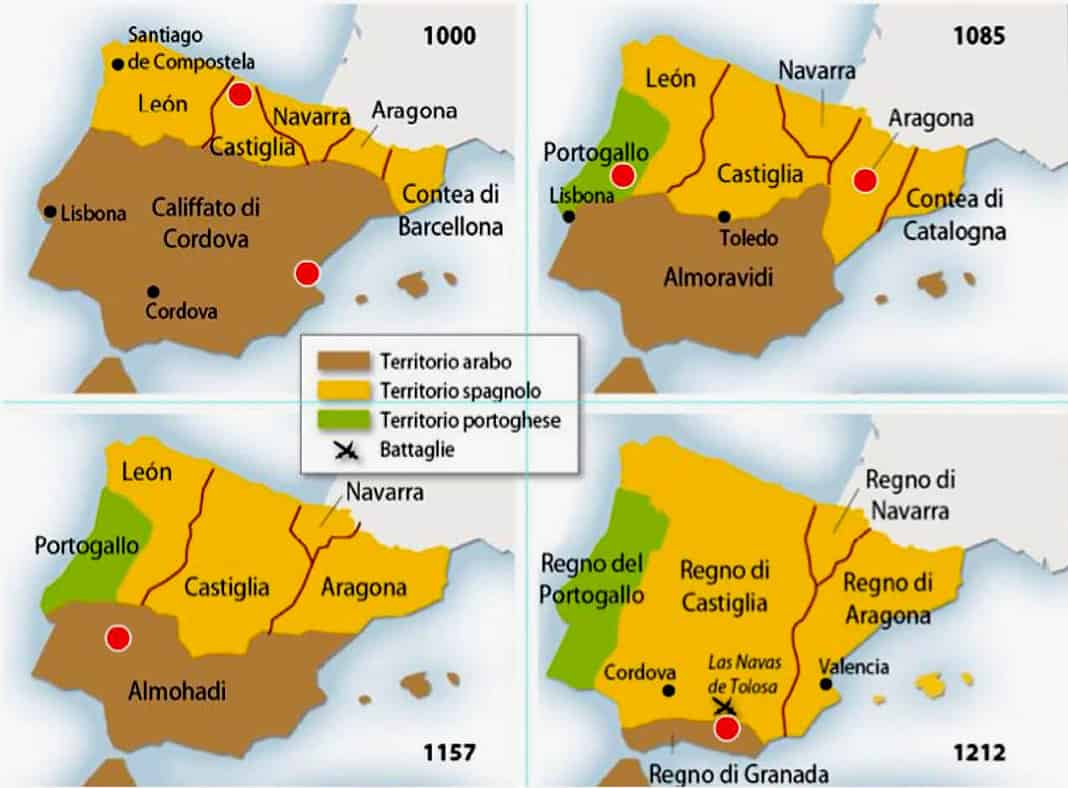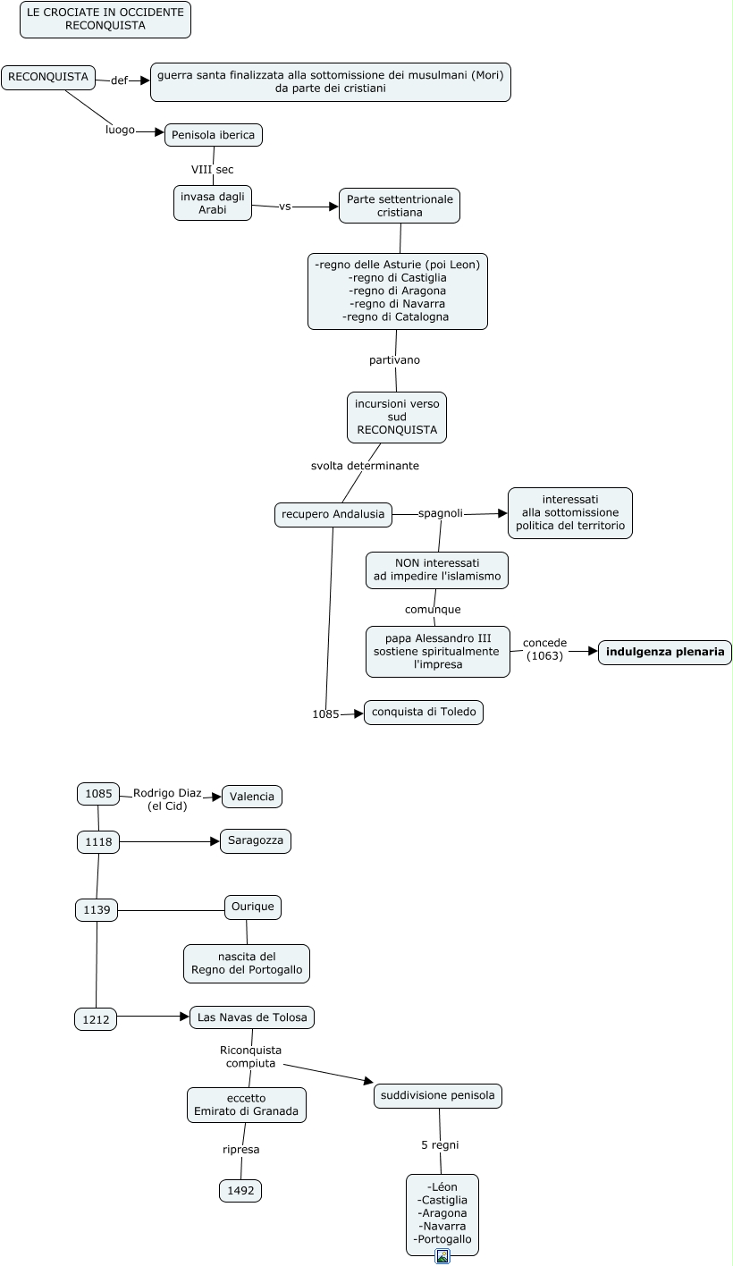 Questa Cmap, creata con IHMC CmapTools, contiene informazioni relative a: reconquista, recupero Andalusia 1085 conquista di Toledo, papa Alessandro III sostiene spiritualmente l'impresa concede (1063) indulgenza plenaria, 1118 1139 1139, 1139 ???? Las Navas de Tolosa, Parte settentrionale cristiana ???? -regno delle Asturie (poi Leon) -regno di Castiglia -regno di Aragona -regno di Navarra -regno di Catalogna, 1118 ???? Saragozza, recupero Andalusia spagnoli NON interessati ad impedire l'islamismo, Penisola iberica VIII sec invasa dagli Arabi, NON interessati ad impedire l'islamismo comunque papa Alessandro III sostiene spiritualmente l'impresa, 1139 ???? 1212, RECONQUISTA luogo Penisola iberica, Ourique ???? nascita del Regno del Portogallo, Las Navas de Tolosa Riconquista compiuta suddivisione penisola, invasa dagli Arabi vs Parte settentrionale cristiana, incursioni verso sud RECONQUISTA svolta determinante recupero Andalusia, suddivisione penisola 5 regni -Léon -Castiglia -Aragona -Navarra -Portogallo, -regno delle Asturie (poi Leon) -regno di Castiglia -regno di Aragona -regno di Navarra -regno di Catalogna partivano incursioni verso sud RECONQUISTA, 1139 ???? Ourique, RECONQUISTA def guerra santa finalizzata alla sottomissione dei musulmani (Mori) da parte dei cristiani, 1085 Rodrigo Diaz (el Cid) Valencia
