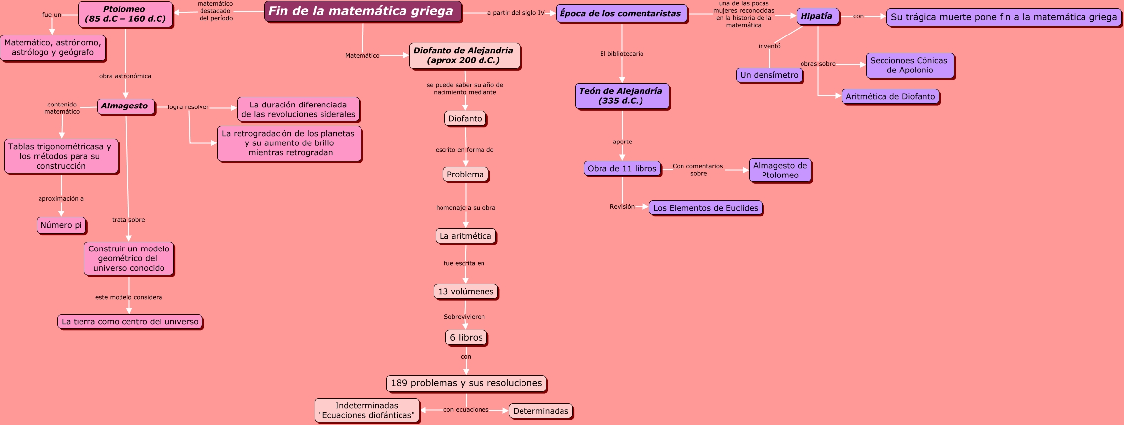 Este Cmap, tiene información relacionada con: Fin de la matemática Griega, Teón de Alejandría (335 d.C.) aporte Obra de 11 libros, Fin de la matemática griega matemático destacado del período Ptolomeo (85 d.C – 160 d.C), Fin de la matemática griega a partir del siglo IV Época de los comentaristas, Época de los comentaristas El bibliotecario Teón de Alejandría (335 d.C.), Almagesto logra resolver La duración diferenciada de las revoluciones siderales, Almagesto logra resolver La retrogradación de los planetas y su aumento de brillo mientras retrogradan, Obra de 11 libros Con comentarios sobre Almagesto de Ptolomeo, 189 problemas y sus resoluciones con ecuaciones Indeterminadas "Ecuaciones diofánticas", Construir un modelo geométrico del universo conocido este modelo considera La tierra como centro del universo, Tablas trigonométricasa y los métodos para su construcción aproximación a Número pi, Fin de la matemática griega Matemático Diofanto de Alejandría (aprox 200 d.C.), Problema homenaje a su obra La aritmética, Diofanto de Alejandría (aprox 200 d.C.) se puede saber su año de nacimiento mediante Diofanto, Almagesto trata sobre Construir un modelo geométrico del universo conocido, 189 problemas y sus resoluciones con ecuaciones Determinadas, Ptolomeo (85 d.C – 160 d.C) fue un Matemático, astrónomo, astrólogo y geógrafo, Almagesto contenido matemático Tablas trigonométricasa y los métodos para su construcción, Hipatía obras sobre Seccionoes Cónicas de Apolonio, Ptolomeo (85 d.C – 160 d.C) obra astronómica Almagesto, Obra de 11 libros Revisión Los Elementos de Euclides