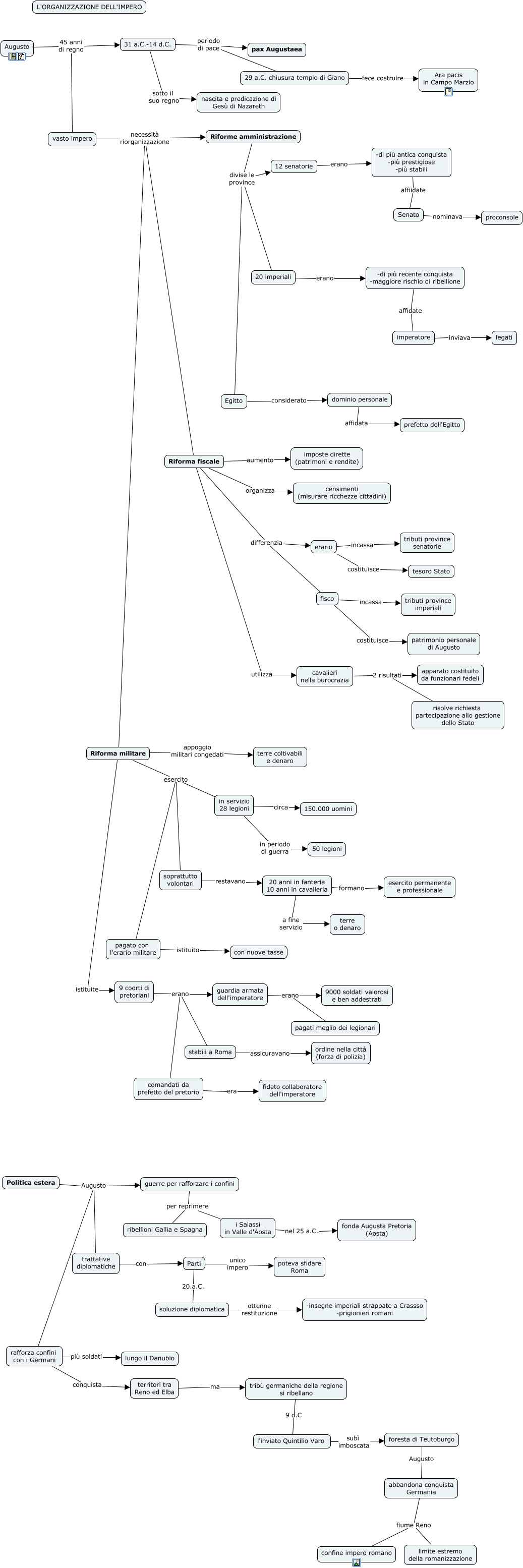 Questa Cmap, creata con IHMC CmapTools, contiene informazioni relative a: Augusto, erario costituisce tesoro Stato, rafforza confini con i Germani conquista territori tra Reno ed Elba, Riforma fiscale differenzia fisco, territori tra Reno ed Elba ma tribù germaniche della regione si ribellano, 20 imperiali erano -di più recente conquista -maggiore rischio di ribellione, Parti 20.a.C. soluzione diplomatica, Riforma militare esercito soprattutto volontari, Riforme amministrazione divise le province 12 senatorie, cavalieri nella burocrazia 2 risultati apparato costituito da funzionari fedeli, Riforma militare esercito pagato con l'erario militare, in servizio 28 legioni circa 150.000 uomini, imperatore inviava legati, dominio personale affidata prefetto dell'Egitto, 31 a.C.-14 d.C. periodo di pace 29 a.C. chiusura tempio di Giano, comandati da prefetto del pretorio era fidato collaboratore dell'imperatore, Riforma fiscale organizza censimenti (misurare ricchezze cittadini), vasto impero necessità riorganizzazione Riforma militare, Riforma fiscale utilizza cavalieri nella burocrazia, l'inviato Quintilio Varo subì imboscata foresta di Teutoburgo, 12 senatorie erano -di più antica conquista -più prestigiose -più stabili
