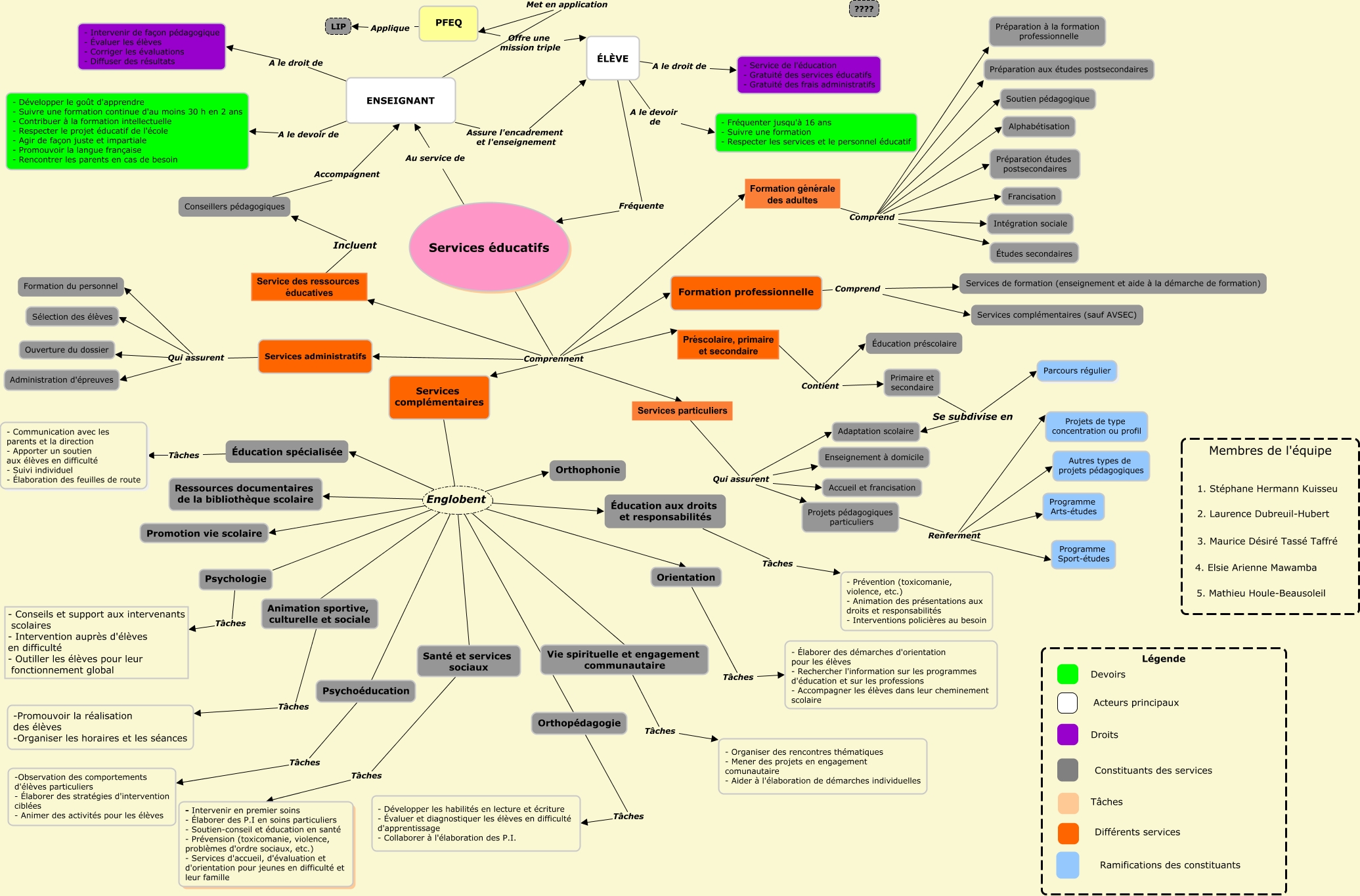 Cette carte de concepts créée avec IHMC CmapTools traite de: Cmap_INT711_VOLET 4 _EQUIPE 9, Formation générale des adultes Comprend Alphabétisation, Services complémentaires Englobent Ressources documentaires de la bibliothèque scolaire, ENSEIGNANT A le devoir de - Développer le goût d'apprendre - Suivre une formation continue d'au moins 30 h en 2 ans - Contribuer à la formation intellectuelle - Respecter le projet éducatif de l'école - Agir de façon juste et impartiale - Promouvoir la langue française - Rencontrer les parents en cas de besoin, Formation générale des adultes Comprend Soutien pédagogique, PFEQ Applique LIP, Services administratifs Qui assurent Administration d'épreuves, Services particuliers Qui assurent Projets pédagogiques particuliers, Services complémentaires Englobent Orientation, ÉLÈVE Fréquente Services éducatifs, Orientation Tâches - Élaborer des démarches d'orientation pour les élèves - Rechercher l'information sur les programmes d'éducation et sur les professions - Accompagner les élèves dans leur cheminement scolaire, Formation professionnelle Comprend Services de formation (enseignement et aide à la démarche de formation), Services éducatifs Comprennent Préscolaire, primaire et secondaire, Services complémentaires Englobent Éducation spécialisée, Services particuliers Qui assurent Enseignement à domicile, Services éducatifs Comprennent Services complémentaires, Formation générale des adultes Comprend Intégration sociale, Primaire et secondaire Se subdivise en Parcours régulier, Services particuliers Qui assurent Adaptation scolaire, Éducation aux droits et responsabilités Tâches - Prévention (toxicomanie, violence, etc.) - Animation des présentations aux droits et responsabilités - Interventions policières au besoin, Services complémentaires Englobent Santé et services sociaux