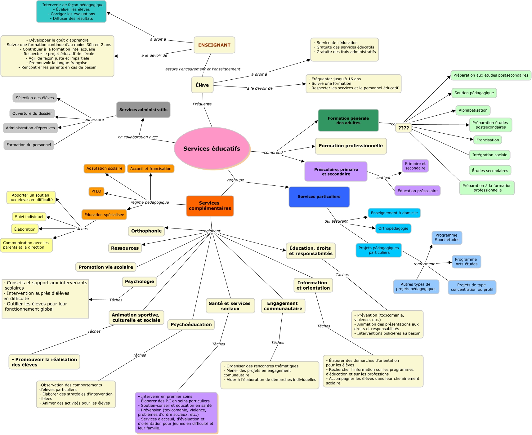 Cette carte de concepts créée avec IHMC CmapTools traite de: Corrigé, Services éducatifs regroupe Services complémentaires, Services complémentaires régime pédagogique Éducation spécialisée, Formation générale des adultes comprend Alphabétisation, Services éducatifs en collaboration avec Services administratifs, Formation générale des adultes comprend Francisation, Services éducatifs comprend Préscolaire, primaire et secondaire, Information et orientation Tâches - Élaborer des démarches d'orientation pour les élèves - Rechercher l'information sur les programmes d'éducation et sur les professions - Accompagner les élèves dans leur cheminement scolaire., Formation générale des adultes comprend Préparation études postsecondaires, Formation générale des adultes comprend Intégration sociale, Services particuliers qui assurent Orthopédagogie, Services éducatifs comprend Formation professionnelle, Services complémentaires régime pédagogique Accueil et francisation, Services complémentaires régime pédagogique Adaptation scolaire, Projets pédagogiques particuliers renferment Programme Arts-études, Formation générale des adultes comprend Préparation aux études postsecondaires, Élève a droit à - Service de l'éducation - Gratuité des services éducatifs - Gratuité des frais administratifs, Services complémentaires englobent Orthophonie, ENSEIGNANT a droit à - Intervenir de façon pédagogique - Évaluer les élèves - Corriger les évaluations - Diffuser des résultats, Éducation spécialisée tâches Apporter un soutien aux élèves en difficulté, Santé et services sociaux Tâches - Intervenir en premier soins - Élaborer des P.I en soins particuliers - Soutien-conseil et éducation en santé - Prévension (toxicomanie, violence, problèmes d'ordre sociaux, etc.) - Services d'acceuil, d'évaluation et d'orientation pour jeunes en difficulté et leur famille.