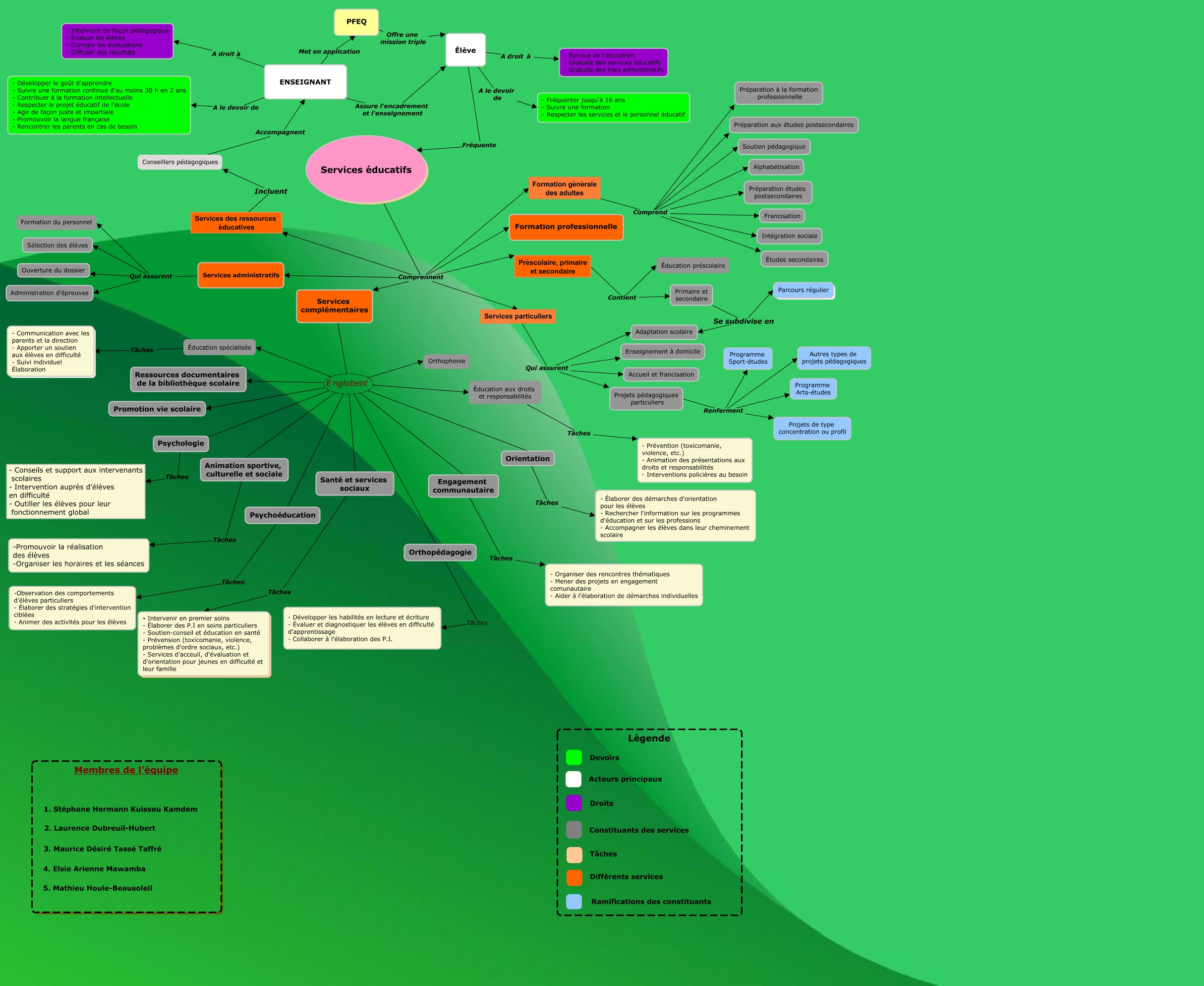 This Concept Map, created with IHMC CmapTools, has information related to: Sans titre, Formation générale des adultes Comprend Francisation, Services administratifs Qui assurent Administration d'épreuves, Services particuliers Qui assurent Projets pédagogiques particuliers, Services complémentaires Englobent Orthophonie, PFEQ Offre une mission triple Élève, Services éducatifs Comprennent Formation générale des adultes, Services éducatifs Comprennent Services des ressources éducatives, Services administratifs Qui assurent Formation du personnel, Psychoéducation Tâches -Observation des comportements d'élèves particuliers - Élaborer des stratégies d'intervention ciblées - Animer des activités pour les élèves, Orientation Tâches - Élaborer des démarches d'orientation pour les élèves - Rechercher l'information sur les programmes d'éducation et sur les professions - Accompagner les élèves dans leur cheminement scolaire, Élève A le devoir de - Fréquenter jusqu'à 16 ans - Suivre une formation - Respecter les services et le personnel éducatif, Primaire et secondaire Se subdivise en Adaptation scolaire, Projets pédagogiques particuliers Renferment Projets de type concentration ou profil, Éducation aux droits et responsabilités Tâches - Prévention (toxicomanie, violence, etc.) - Animation des présentations aux droits et responsabilités - Interventions policières au besoin, Services complémentaires Englobent Orientation, Élève Fréquente Services éducatifs, Projets pédagogiques particuliers Renferment Autres types de projets pédagogiques, Primaire et secondaire Se subdivise en Parcours régulier, Services complémentaires Englobent Promotion vie scolaire, Engagement communautaire Tâches - Organiser des rencontres thématiques - Mener des projets en engagement comunautaire - Aider à l'élaboration de démarches individuelles