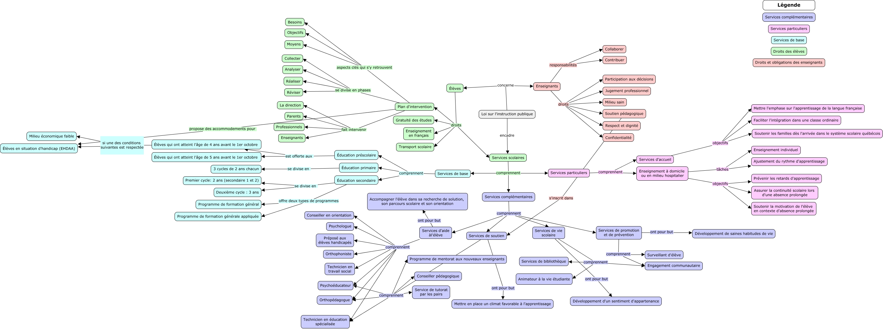 Cette carte de concepts créée avec IHMC CmapTools traite de: Volet 4 - VF1, Enseignants droits Soutien pédagogique, Services de promotion et de prévention comprennent Surveillant d'élève, Services d'accueil objectifs Faciliter l'intégration dans une classe ordinaire, Enseignants droits Jugement professionnel, Enseignement à domicile ou en milieu hospitalier tâches Enseignement individuel, Plan d'intervention aspects clés qui s'y retrouvent Moyens, Éducation secondaire offre deux types de programmes Programme de formation générale appliquée, Plan d'intervention se divise en phases Réviser, Plan d'intervention fait intervenir La direction, Services complémentaires comprennent Services de soutien, Services d'aide àl'élève comprennent Technicien en éducation spécialisée, Services d'aide àl'élève ont pour but Accompagner l'élève dans sa recherche de solution, son parcours scolaire et son orientation, Soutien pédagogique s'inscrit dans Services de soutien, Services de base comprennent Éducation préscolaire, Élèves droits Services scolaires, Services de vie scolaire comprennent Animateur à la vie étudiante, Services de soutien comprennent Orthopédagogue, Services de vie scolaire ont pour but Développement d'un sentiment d'appartenance, Services de base comprennent Éducation secondaire, Services d'aide àl'élève comprennent Psychoéducateur
