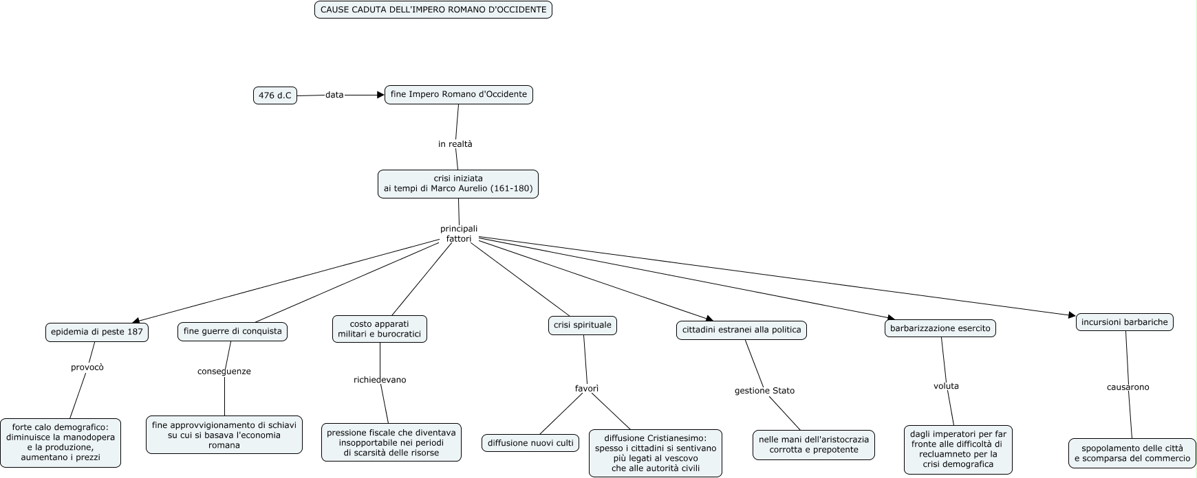 Questa Cmap, creata con IHMC CmapTools, contiene informazioni relative a: Cause caduta, crisi iniziata ai tempi di Marco Aurelio (161-180) principali fattori crisi spirituale, cittadini estranei alla politica gestione Stato nelle mani dell'aristocrazia corrotta e prepotente, crisi spirituale favorì diffusione nuovi culti, crisi iniziata ai tempi di Marco Aurelio (161-180) principali fattori incursioni barbariche, incursioni barbariche causarono spopolamento delle città e scomparsa del commercio, costo apparati militari e burocratici richiedevano pressione fiscale che diventava insopportabile nei periodi di scarsità delle risorse, epidemia di peste 187 provocò forte calo demografico: diminuisce la manodopera e la produzione, aumentano i prezzi, crisi spirituale favorì diffusione Cristianesimo: spesso i cittadini si sentivano più legati al vescovo che alle autorità civili, barbarizzazione esercito voluta dagli imperatori per far fronte alle difficoltà di recluamneto per la crisi demografica, crisi iniziata ai tempi di Marco Aurelio (161-180) principali fattori costo apparati militari e burocratici, crisi iniziata ai tempi di Marco Aurelio (161-180) principali fattori barbarizzazione esercito, 476 d.C data fine Impero Romano d'Occidente, crisi iniziata ai tempi di Marco Aurelio (161-180) principali fattori fine guerre di conquista, fine guerre di conquista conseguenze fine approvvigionamento di schiavi su cui si basava l'economia romana, crisi iniziata ai tempi di Marco Aurelio (161-180) principali fattori cittadini estranei alla politica, fine Impero Romano d'Occidente in realtà crisi iniziata ai tempi di Marco Aurelio (161-180), crisi iniziata ai tempi di Marco Aurelio (161-180) principali fattori epidemia di peste 187