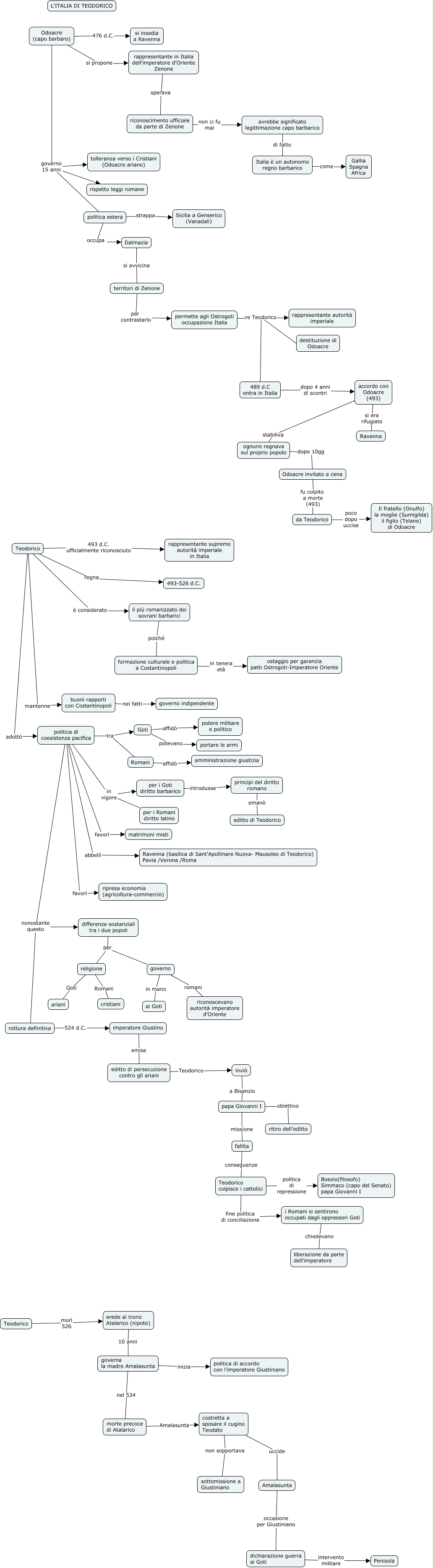 Questa Cmap, creata con IHMC CmapTools, contiene informazioni relative a: Teodorico, Teodorico adottò politica di coesistenza pacifica, Teodorico regna 493-526 d.C., politica di coesistenza pacifica in vigore per i Romani diritto latino, accordo con Odoacre (493) si era rifugiato Ravenna, Goti potevano portare le armi, Odoacre (capo barbaro) 476 d.C. si insedia a Ravenna, Odoacre (capo barbaro) governo 15 anni politica estera, da Teodorico poco dopo uccise Il fratello (Onulfo) la moglie (Sumigilda) il figlio (Telane) di Odoacre, papa Giovanni I obiettivo ritiro dell'editto, permette agli Ostrogoti occupazione Italia re Teodorico rappresentante autorità imperiale, i Romani si sentirono occupati dagli oppressori Goti chiedevano liberazione da parte dell'imperatore, Romani affidò amministrazione giustizia, differenze sostanziali tra i due popoli per governo, politica di coesistenza pacifica favorì ripresa economia (agricoltura-commercio), 489 d.C entra in Italia dopo 4 anni di scontri accordo con Odoacre (493), costretta a sposare il cugino Teodato uccide Amalasunta, Italia è un autonomo regno barbarico come Gallia Spagna Africa, Odoacre (capo barbaro) governo 15 anni tolleranza verso i Cristiani (Odoacre ariano), Teodorico colpisce i cattolici politica di repressione Boezio(filosofo) Simmaco (capo del Senato) papa Giovanni I, governo in mano ai Goti
