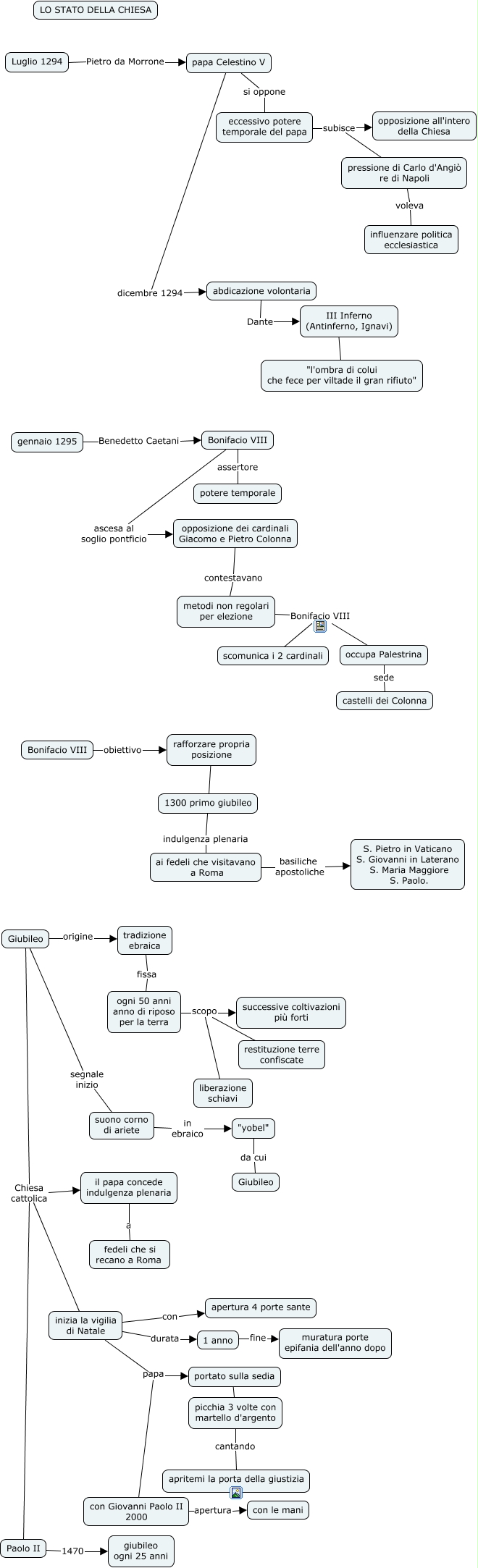 Questa Cmap, creata con IHMC CmapTools, contiene informazioni relative a: 2 Chiesa, "yobel" da cui Giubileo, inizia la vigilia di Natale papa portato sulla sedia, inizia la vigilia di Natale durata 1 anno, con Giovanni Paolo II 2000 apertura con le mani, Paolo II 1470 giubileo ogni 25 anni, Giubileo Chiesa cattolica inizia la vigilia di Natale, metodi non regolari per elezione Bonifacio VIII scomunica i 2 cardinali, ai fedeli che visitavano a Roma basiliche apostoliche S. Pietro in Vaticano S. Giovanni in Laterano S. Maria Maggiore S. Paolo., papa Celestino V dicembre 1294 abdicazione volontaria, eccessivo potere temporale del papa subisce pressione di Carlo d'Angiò re di Napoli, metodi non regolari per elezione Bonifacio VIII occupa Palestrina, pressione di Carlo d'Angiò re di Napoli voleva influenzare politica ecclesiastica, Bonifacio VIII ascesa al soglio pontficio opposizione dei cardinali Giacomo e Pietro Colonna, ogni 50 anni anno di riposo per la terra scopo successive coltivazioni più forti, Giubileo origine tradizione ebraica, Giubileo Chiesa cattolica il papa concede indulgenza plenaria, opposizione dei cardinali Giacomo e Pietro Colonna contestavano metodi non regolari per elezione, Bonifacio VIII assertore potere temporale, 1 anno fine muratura porte epifania dell'anno dopo, Luglio 1294 Pietro da Morrone papa Celestino V