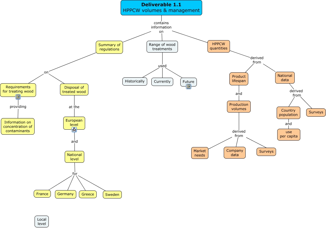 This Concept Map, created with IHMC CmapTools, has information related to: D1-1 outline CXL, Range of wood treatments used Currently, Summary of regulations on Disposal of treated wood, National level for France, National level for Greece, National level for Germany, National data derived from Surveys, Deliverable 1.1 HPPCW volumes & management contains information on HPPCW quantities, Range of wood treatments used Future, European level and National level, HPPCW quantities derived from Product lifespan, Deliverable 1.1 HPPCW volumes & management contains information on Range of wood treatments, National level for Sweden, National data derived from Country population, Summary of regulations on Requirements for treating wood, HPPCW quantities derived from National data, Production volumes derived from Market needs, Range of wood treatments used Historically, Production volumes derived from Company data, Product lifespan and Production volumes, Requirements for treating wood providing Information on concentration of contaminants