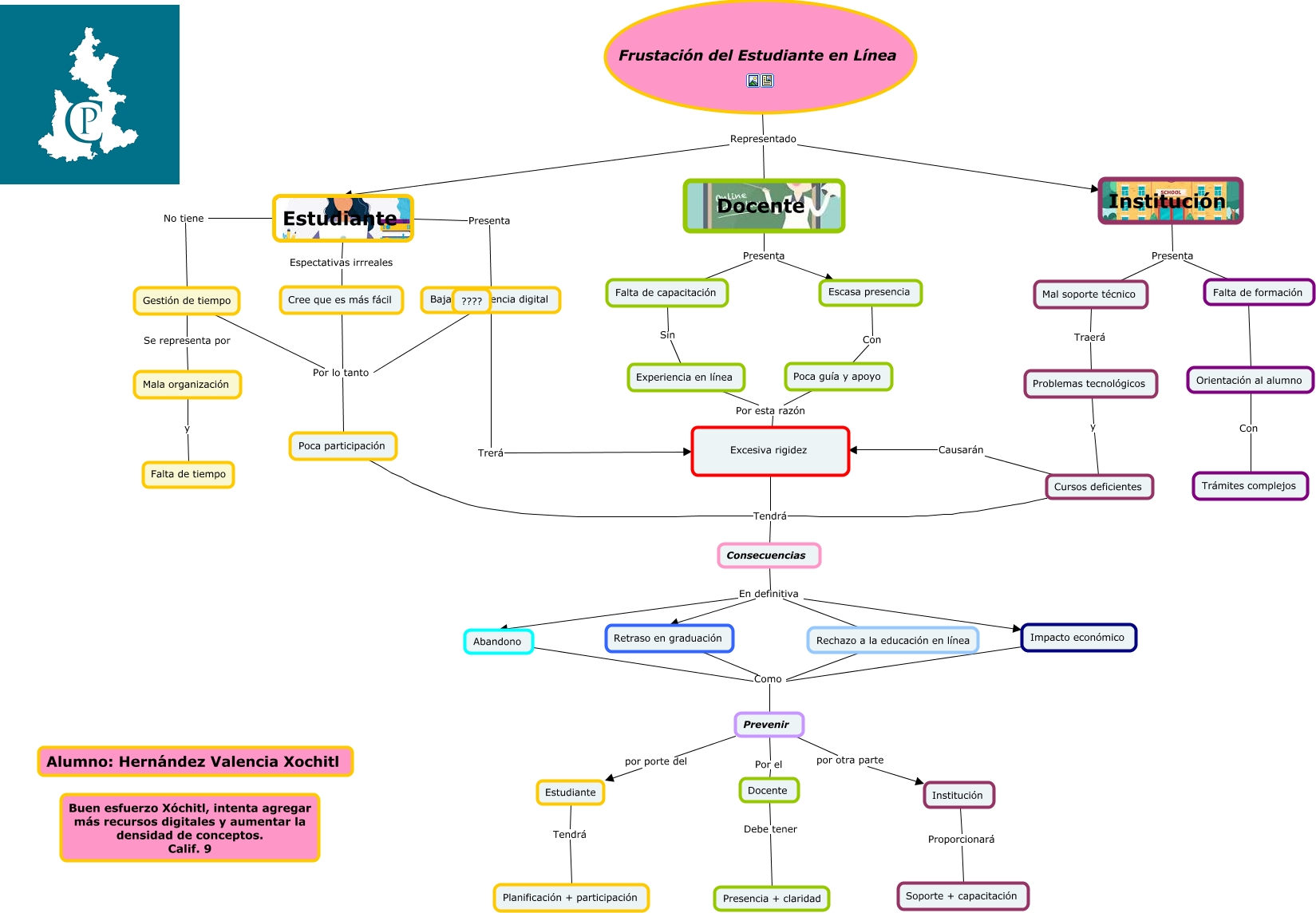 Este Cmap, tiene información relacionada con: Frustración del estudiante en Línea, Frustación del Estudiante en Línea Representado Institución, Docente Presenta Escasa presencia, Impacto económico Como Prevenir, Rechazo a la educación en línea Como Prevenir, Docente Debe tener Presencia + claridad, Gestión de tiempo Se representa por Mala organización, Mal soporte técnico Traerá Problemas tecnológicos, Consecuencias En definitiva Abandono, Problemas tecnológicos y Cursos deficientes, Falta de formación Sin Orientación al alumno, Poca guía y apoyo Por esta razón Excesiva rigidez, Estudiante Espectativas irrreales Cree que es más fácil, Estudiante No tiene Gestión de tiempo, Institución Presenta Falta de formación, Prevenir por porte del Estudiante, Baja competencia digital Por lo tanto Poca participación, Institución Presenta Mal soporte técnico, Experiencia en línea Por esta razón Excesiva rigidez, Prevenir por otra parte Institución, Docente Presenta Falta de capacitación