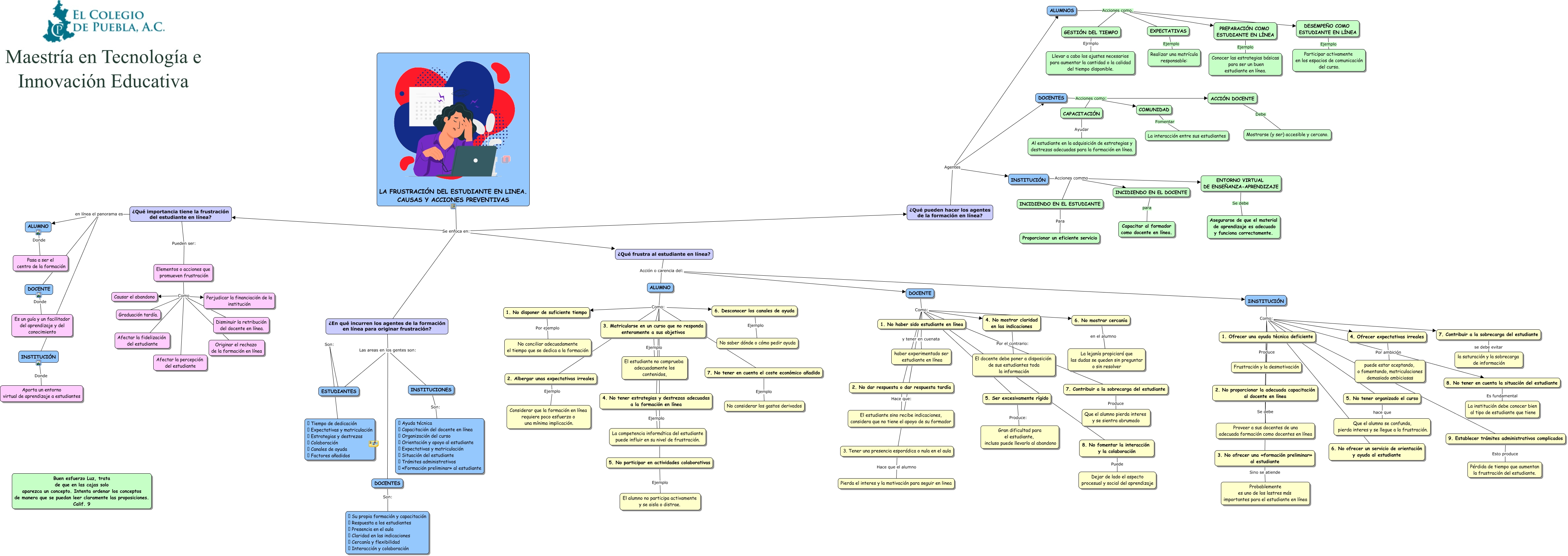Este Cmap, tiene información relacionada con: Frustracion del estudiante en linea, ¿Qué frustra al estudiante en línea? Acción o carencia del: DOCENTE, IiNSTITUCIÓN Como: 6. No ofrecer un servicio de orientación y ayuda al estudiante, 5. Ser excesivamente rígido Produce: Gran dificultad para el estudiante, incluso puede llevarlo al abandono, DOCENTES Acciones como: ACCIÓN DOCENTE, LA FRUSTRACIÓN DEL ESTUDIANTE EN LINEA. CAUSAS Y ACCIONES PREVENTIVAS Se enfoca en: ¿Qué frustra al estudiante en línea?, 3. Matricularse en un curso que no responda enteramente a sus objetivos Ejemplo El estudiante no comprueba adecuadamente los contenidos,, ¿Qué pueden hacer los agentes de la formación en línea? Agentes DOCENTES, Elementos o acciones que promueven frustración Como Originar el rechazo de la formación en línea, Elementos o acciones que promueven frustración Como Afectar la fidelización del estudiante, Elementos o acciones que promueven frustración Como Perjudicar la financiación de la institución, 3. Tener una presencia esporádica o nula en el aula Hace que el alumno Pierda el interes y la motivación para seguir en linea, 7. Contribuir a la sobrecarga del estudiante se debe evitar la saturación y la sobrecarga de información, 9. Establecer trámites administrativos complicados Esto produce Pérdida de tiempo que aumentan la frustración del estudiante., DOCENTE Como: 6. No mostrar cercanía, DOCENTE Como: 2. No dar respuesta o dar respuesta tardía, IiNSTITUCIÓN Como: 9. Establecer trámites administrativos complicados, 7. Contribuir a la sobrecarga del estudiante Produce Que el alumno pierda interes y se sientra abrumado, 5. No participar en actividades colaborativas Ejemplo El alumno no participa activamente y se aisla o distrae., DOCENTES Acciones como: COMUNIDAD, ¿Qué pueden hacer los agentes de la formación en línea? Agentes ALUMNOS