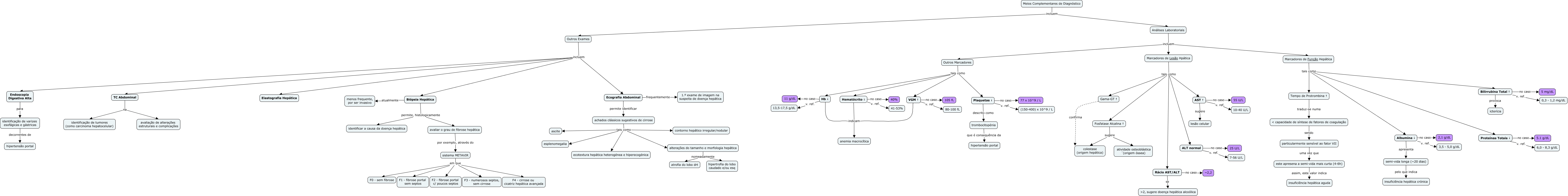 Esse mapa conceitual, produzido no IHMC CmapTools, tem a informação relacionada a: Cirrose Bea, AST ↑ v. ref. 10-40 U/L, ALT normal no caso 25 U/L, Plaquetas ↓ descrito como trombocitopénia, alterações do tamanho e morfologia hepática nomeadamente hipertrofia do lobo caudado e/ou esq, Hematócrito ↓ indicam anemia macrocítica, Análises Laboratoriais incluem Outros Marcadores, semi-vida longa (~20 dias) pelo que indica insuficiência hepática crónica, Tempo de Protrombina ↑ traduz-se numa < capacidade de síntese de fatores de coagulação, Marcadores de Função Hepática tais como Bilirrubina Total ↑, sistema METAVIR em que F2 - fibrose portal c/ poucos septos, Marcadores de Função Hepática tais como Albumina ↓, Hematócrito ↓ v. ref. 41-53%, Plaquetas ↓ v. ref. (150-400) x 10^9 / L, VGM ↑ no caso 105 fL, TC Abdominal na avaliação de alterações estruturais e complicações, Outros Marcadores tais como Plaquetas ↓, Marcadores de Lesão Hpática tais como Fosfatase Alcalina ↑, Biópsia Hepática permite, histologicamente avaliar o grau de fibrose hepática, Análises Laboratoriais incluem Marcadores de Lesão Hpática, particularmente sensível ao fator VII uma vez que este apresena a semi-vida mais curta (4-6h)