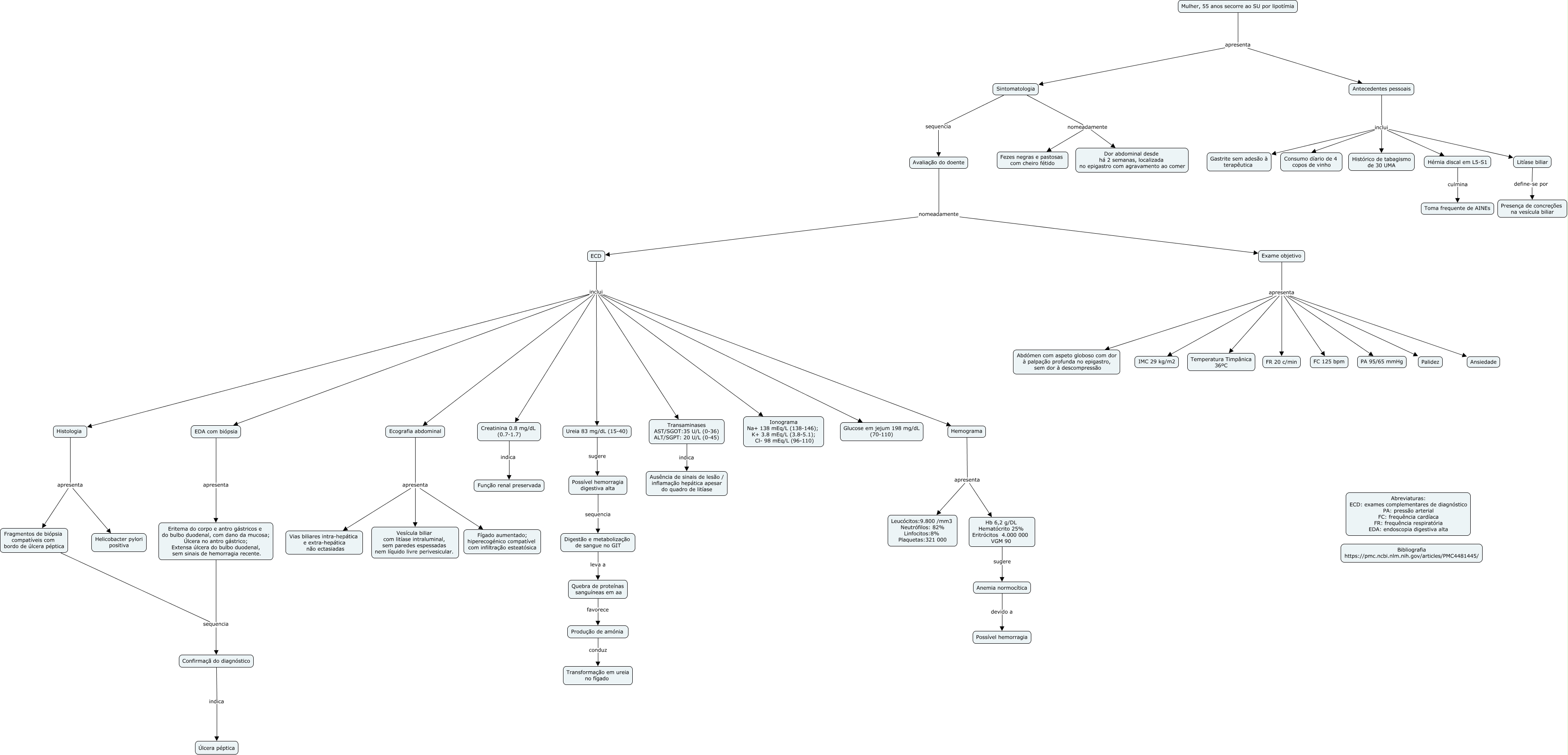 Esse mapa conceitual, produzido no IHMC CmapTools, tem a informação relacionada a: Ulcera 14.03 9,55, ECD inclui EDA com biópsia, Quebra de proteínas sanguíneas em aa favorece Produção de amónia, ECD inclui Creatinina 0.8 mg/dL (0.7-1.7), Histologia apresenta Helicobacter pylori positiva, Ureia 83 mg/dL (15-40) sugere Possível hemorragia digestiva alta, Anemia normocítica devido a Possível hemorragia, Sintomatologia nomeadamente Fezes negras e pastosas com cheiro fétido, Ecografia abdominal apresenta Vias biliares intra-hepática e extra-hepática não ectasiadas, Sintomatologia sequencia Avaliação do doente, Ecografia abdominal apresenta Fígado aumentado; hiperecogénico compatível com infiltração esteatósica, ECD inclui Hemograma, ECD inclui Ionograma Na+ 138 mEq/L (138-146); K+ 3.8 mEq/L (3.8-5.1); Cl- 98 mEq/L (96-110), Antecedentes pessoais inclui Gastrite sem adesão à terapêutica, Exame objetivo apresenta Temperatura Timpânica 36ºC, Exame objetivo apresenta Ansiedade, Exame objetivo apresenta Abdómen com aspeto globoso com dor à palpação profunda no epigastro, sem dor à descompressão, Antecedentes pessoais inclui Histórico de tabagismo de 30 UMA, Exame objetivo apresenta FR 20 c/min, Hemograma apresenta Leucócitos:9.800 /mm3 Neutrófilos: 82% Linfocitos:8% Plaquetas:321 000, ECD inclui Glucose em jejum 198 mg/dL (70-110)