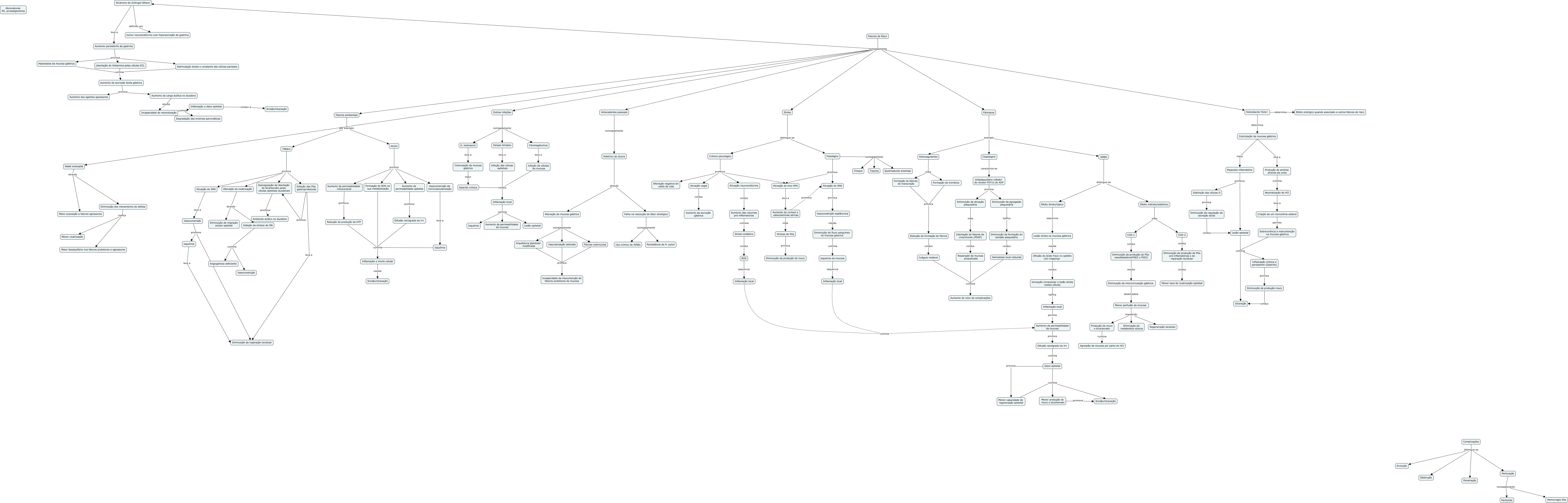 Esse mapa conceitual, produzido no IHMC CmapTools, tem a informação relacionada a: DUP_1, AINEs distingue-se Efeito direto/tópico, COX-2 conduz Diminuição da produção de PGs pró-inflamatórias e de reparação tecidular, Fisiológico nomeadamente Trauma, Isquémia leva a Diminuição da reparação tecidular, Menor capacidade de regeneração epitelial culmina Menor produção de muco e bicarbonato, Disfunção das células D provoca Diminuição da regulação da secreção ácida, Vasoconstrição esplâncnica resulta Diminuição do fluxo sanguíneo na mucosa gástrica, Crónico psicológico promove Ativação do eixo HPA, Desregulação da libertação de bicarbonato pelas células epiteliais duodenais promove Ambiente acídico no duodeno, Ativação neuroendócrina conduz Aumento das citocinas pró-inflamatórias, Stress distingue-se Fisiológico, Diminuição da regulação da secreção ácida conduz Lesão epitelial, Outras infeções nomeadamente H. heilmannii, Outras infeções nomeadamente Herpes Simplex, Inflamação local culmina Aumento da permeabilidade da mucosa, Diminuição do fluxo sanguíneo na mucosa gástrica culmina Isquémia da mucosa, Libertação de Histamina pelas células ECL culmina Aumento da secreção ácida gástrica, Inflamação e dano epitelial conduz a Erosão/Ulceração, Infeção das células epiteliais conduz Inflamação local, Inflamação local culmina Lesão epitelial