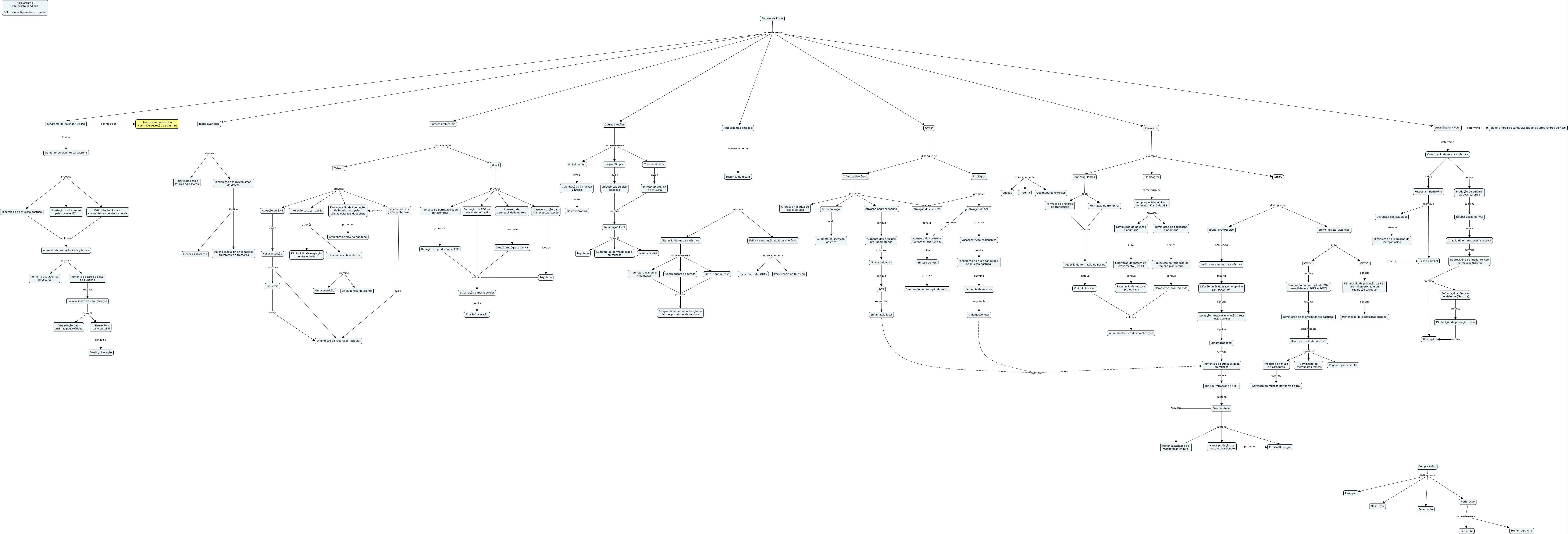 Esse mapa conceitual, produzido no IHMC CmapTools, tem a informação relacionada a: DUP_1 sara por acabar, Dano epitelial culmina Erosão/Ulceração, Hiperplasia da mucosa gástrica culmina Aumento da secreção ácida gástrica, Anticoagulantes inibe Formação de trombina, Arquitetura glandular modificada provoca Incapacidade da manuntenção de fatores protetores da mucosa, Diminuição da regulação da secreção ácida conduz Lesão epitelial, Aumento do cortisol e catecolaminas séricas inibe Síntese de PGs, Isquémia da mucosa sequencia Inflamação local, Diminuição da ativação plaquetária inibe Libertação de fatores de crescimento (PDGF), Inflamação local culmina Aumento da permeabilidade da mucosa, Aumento da secreção ácida gástrica provoca Aumento da carga acídica no duodeno, Vasoconstrição promove Isquémia, Menor perfusão da mucosa impedindo Produção de muco e bicarbonato, Diminuição da agregação plaquetária tipifica Diminuição da formação do tampão plaquetário, Antiplaquetário inibidor do recetor P2Y12 do ADP provoca Diminuição da ativação plaquetária, Sobrevivência e manuntenção na mucosa gástrica culmina Ulceração, Aumento da permeabilidade mitocondrial promove Redução da produção de ATP, Inflamação e morte celular resulta Erosão/Ulceração, Diminuição da microcirculação gástrica desencadeia Menor perfusão da mucosa, Fisiológico nomeadamente Choque, Síndrome de Zollinger-Ellison definido por Tumor neuroendócrino com hipersecreção de gastrina