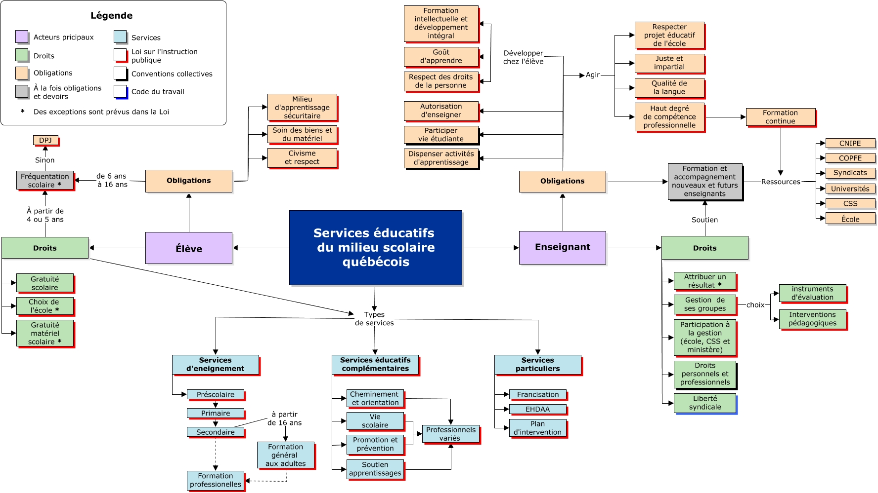 Cette carte de concepts créée avec IHMC CmapTools traite de: Services éducatif VF équipe 9, Enseignant Obligations, Obligations Civisme et respect, Préscolaire Primaire, Services particuliers Plan d'intervention, Services éducatifs complémentaires Vie scolaire, Gestion de ses groupes choix Interventions pédagogiques, Formation et accompagnement nouveaux et futurs enseignants Ressources CSS, Droits Types de services Services éducatifs complémentaires, Droits Gratuité matériel scolaire *, Vie scolaire Professionnels variés, Obligations de 6 ans à 16 ans Fréquentation scolaire *, Obligations Développer chez l'élève Respect des droits de la personne, Enseignant Droits, Promotion et prévention Professionnels variés, Formation général aux adultes Formation professionelles, Formation continue Ressources Universités, Formation et accompagnement nouveaux et futurs enseignants Ressources CNIPE, Obligations Développer chez l'élève Goût d'apprendre, Formation continue Ressources CSS, Élève Obligations