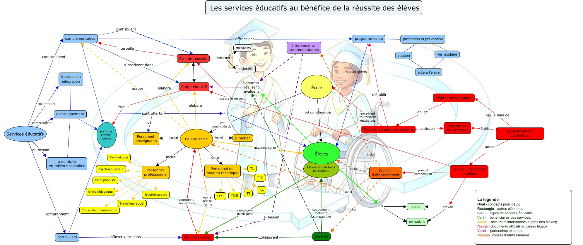 Cette carte de concepts créée avec IHMC CmapTools traite de: L'organisation des services éducatifs en milieu scolaire, d'enseignement point de conver- gence, Services éducatifs au besoin à domicile en milieu hospitalier, Personnel de soutien technique TES, Équipe-école inclut Personnel enseignants, Services éducatifs comprennent particuliers, Loi sur l'instruction publique assure le respect Plan de réussite, Plan de réussite détermine objectifs, Personnel professionnel Conseilliier d'orientation, promotion et prévention soutien, Intervenants communautaires si besoin Plan d'intervention, École est constituée des Élèves, complémentaires point de conver- gence, d'enseignement à domicile en milieu hospitalier, Personnel professionnel Travailleur social, Équipe-école inclut Personnel de soutien technique, Personnel de soutien technique TL, Services éducatifs au besoin francisation intégration, Loi sur l'instruction publique prévoit obligations, Gouvernement du Québec par le bias de Régime pédagogique, Centres de services scolaire appliquent Programme de formation