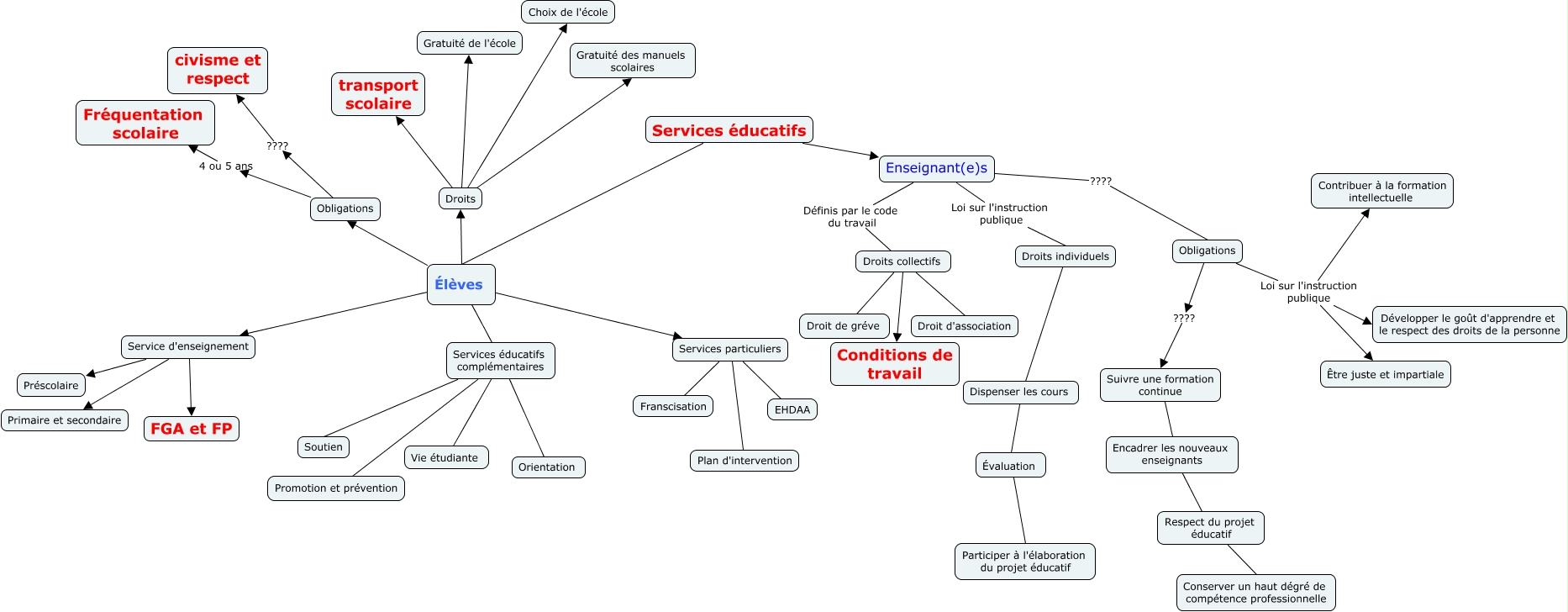 Cette carte de concepts créée avec IHMC CmapTools traite de: Sans titre, Enseignant(e)s Définis par le code du travail Droits collectifs, Élèves Services particuliers, Obligations ???? civisme et respect, Droits Gratuité des manuels scolaires, Obligations Loi sur l'instruction publique Être juste et impartiale, Services particuliers EHDAA, Élèves Obligations, Services particuliers Franscisation, Élèves Droits, Services éducatifs complémentaires Orientation, Dispenser les cours Évaluation, Enseignant(e)s Loi sur l'instruction publique Droits individuels, Obligations Loi sur l'instruction publique Contribuer à la formation intellectuelle, Droits individuels Dispenser les cours, Droits Choix de l'école, Services particuliers Plan d'intervention, Évaluation Participer à l'élaboration du projet éducatif, Respect du projet éducatif Conserver un haut dégré de compétence professionnelle, Obligations 4 ou 5 ans Fréquentation scolaire, Droits transport scolaire