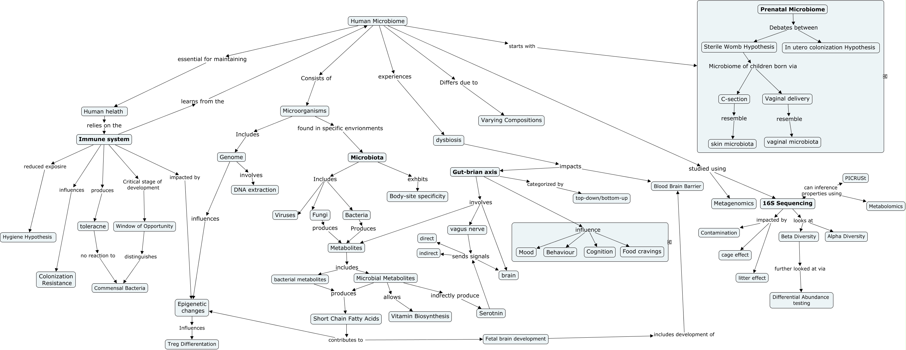 This Concept Map, created with IHMC CmapTools, has information related to: HMB385 Concept Map Draft, Immune system Critical stage of development Window of Opportunity, Microorganisms Includes Genome, Fetal brain development includes development of Blood Brain Barrier, Prenatal Microbiome Debates between Sterile Womb Hypothesis, Metabolites includes Microbial Metabolites, Gut-brian axis influence Cognition, Immune system influences Colonization Resistance, Human Microbiome Differs due to Varying Compositions, vagus nerve sends signals direct, Human Microbiome experiences dysbiosis, Sterile Womb Hypothesis Microbiome of children born via C-section, Short Chain Fatty Acids contributes to Epigenetic changes, toleracne no reaction to Commensal Bacteria, Window of Opportunity distinguishes Commensal Bacteria, Human Microbiome starts with Prenatial Microbiome, vagus nerve sends signals indirect, Gut-brian axis influence Mood, Microbiota Includes Fungi, Sterile Womb Hypothesis Microbiome of children born via Vaginal delivery, Gut-brian axis involves vagus nerve