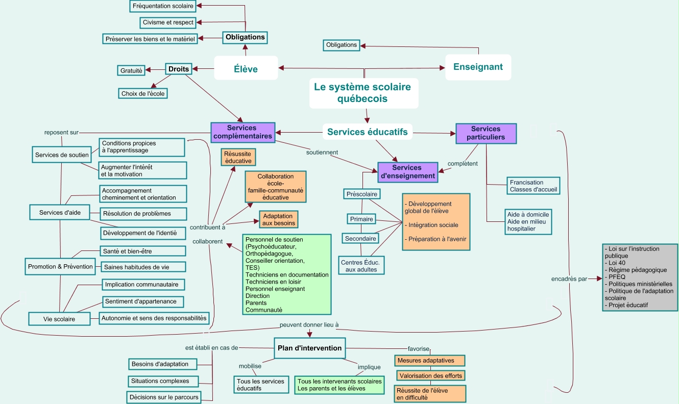 Cette carte de concepts créée avec IHMC CmapTools traite de: Brouillon-Imen Boughattas, Primaire - Développement global de l'élève - Intégration sociale - Préparation à l'avenir, Vie scolaire Implication communautaire, Services d'aide Accompagnement cheminement et orientation, Plan d'intervention favorise Mesures adaptatives, Le système scolaire québecois Élève, Secondaire - Développement global de l'élève - Intégration sociale - Préparation à l'avenir, Obligations Préserver les biens et le matériel, Préscolaire - Développement global de l'élève - Intégration sociale - Préparation à l'avenir, Services éducatifs Services d'enseignement, Promotion & Prévention Saines habitudes de vie, Mesures adaptatives Valorisation des efforts, Services particuliers Aide à domicile Aide en milieu hospitalier, Droits Choix de l'école, Personnel de soutien (Psychoéducateur, Orthopédagogue, Conseiller orientation, TES) Techniciens en documentation Techniciens en loisir Personnel enseignant Direction Parents Communauté contribuent à collaborent Adaptation aux besoins, Personnel de soutien (Psychoéducateur, Orthopédagogue, Conseiller orientation, TES) Techniciens en documentation Techniciens en loisir Personnel enseignant Direction Parents Communauté contribuent à collaborent, Vie scolaire Sentiment d'appartenance, Centres Éduc. aux adultes - Développement global de l'élève - Intégration sociale - Préparation à l'avenir, Services d'aide Résolution de problèmes, Promotion & Prévention Santé et bien-être, Services de soutien Services d'aide