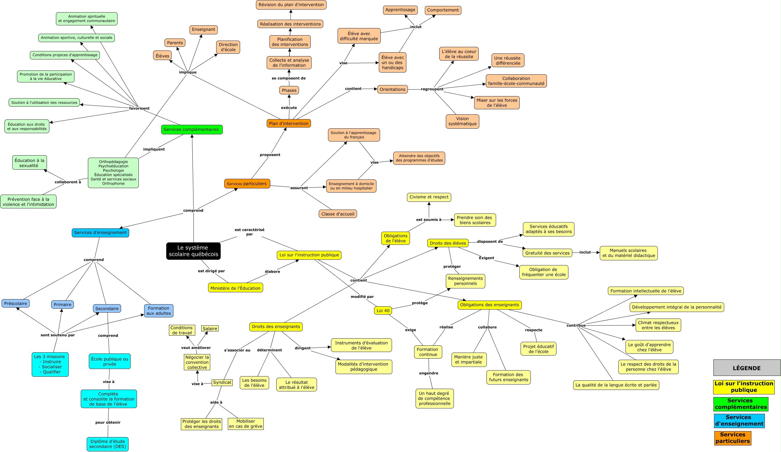 Cette carte de concepts créée avec IHMC CmapTools traite de: Schema - Team X, Négocier la convention collective veut améliorer Salaire, Obligations des enseignants contribue Formation intellectuelle de l'élève, Services complémentaires favorisent Promotion de la participation à la vie éducative, Droits des enseignants dirigent Instruments d’évaluation de l'élève, Plan d'intervention implique Enseignant, Les 3 missions - Instruire - Socialiser - Qualifier sont soutenu par Secondaire, Services particuliers proposent Plan d'intervention, Soutien à l'apprentissage du français vise Atteindre des objectifs des programmes d'études, Services complémentaires favorisent Soutien à l'utilisation des ressources, Droits des élèves protéger Renseignements personnels, Élève avec un ou des handicaps inclut Comportement, Plan d'intervention implique Orthopédagogie Psychoéducation Psychologie Éducation spécialisée Santé et services sociaux Orthophonie, Obligations des enseignants respecte Projet éducatif de l'école, Plan d'intervention vise Élève avec un ou des handicaps, Services complémentaires favorisent Animation spirituelle et engagement communautaire, Secondaire comprend École publique ou privée, Élève avec un ou des handicaps inclut Apprentissage, Droits des enseignants déterminent Les besoins de l'élève, Plan d'intervention exécute Phases, Gratuité des services inclut Manuels scolaires et du matériel didactique