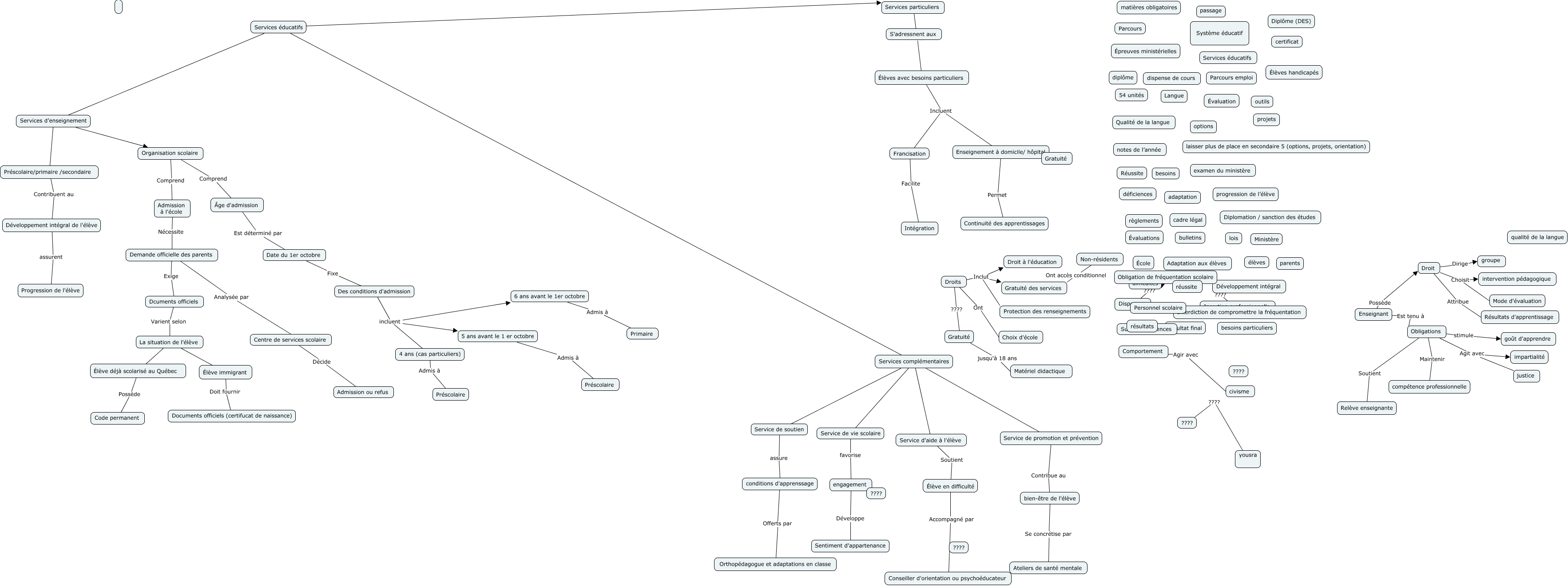 Cette carte de concepts créée avec IHMC CmapTools traite de: Carte conceptuelle D_Larkin Y_Zaoui.cmap 1.1, Francisation Facilite Intégration, 5 ans avant le 1 er octobre Admis à Préscolaire, La situation de l'élève Élève immigrant, Services complémentaires Service de promotion et prévention, Services complémentaires Service de soutien, Organisation scolaire Comprend Admission à l'école, Services particuliers Aide Élèves avec besoins particuliers, Élève déjà scolarisé au Québec Possède Code permanent, Dispenses ???? Obligation de fréquentation scolaire, engagement Développe Sentiment d'appartenance, Droits Inclut Gratuité des services, Services d’enseignement Organisation scolaire, Droits ???? Gratuité, yousra ???? ????, Des conditions d'admission incluent 5 ans avant le 1 er octobre, Date du 1er octobre Fixe Des conditions d'admission, Élèves avec besoins particuliers Incluent Enseignement à domicile/ hôpital, Services éducatifs Services particuliers, Élève immigrant Doit fournir Documents officiels (certifucat de naissance), Élève en difficulté Accompagné par Conseiller d'orientation ou psychoéducateur