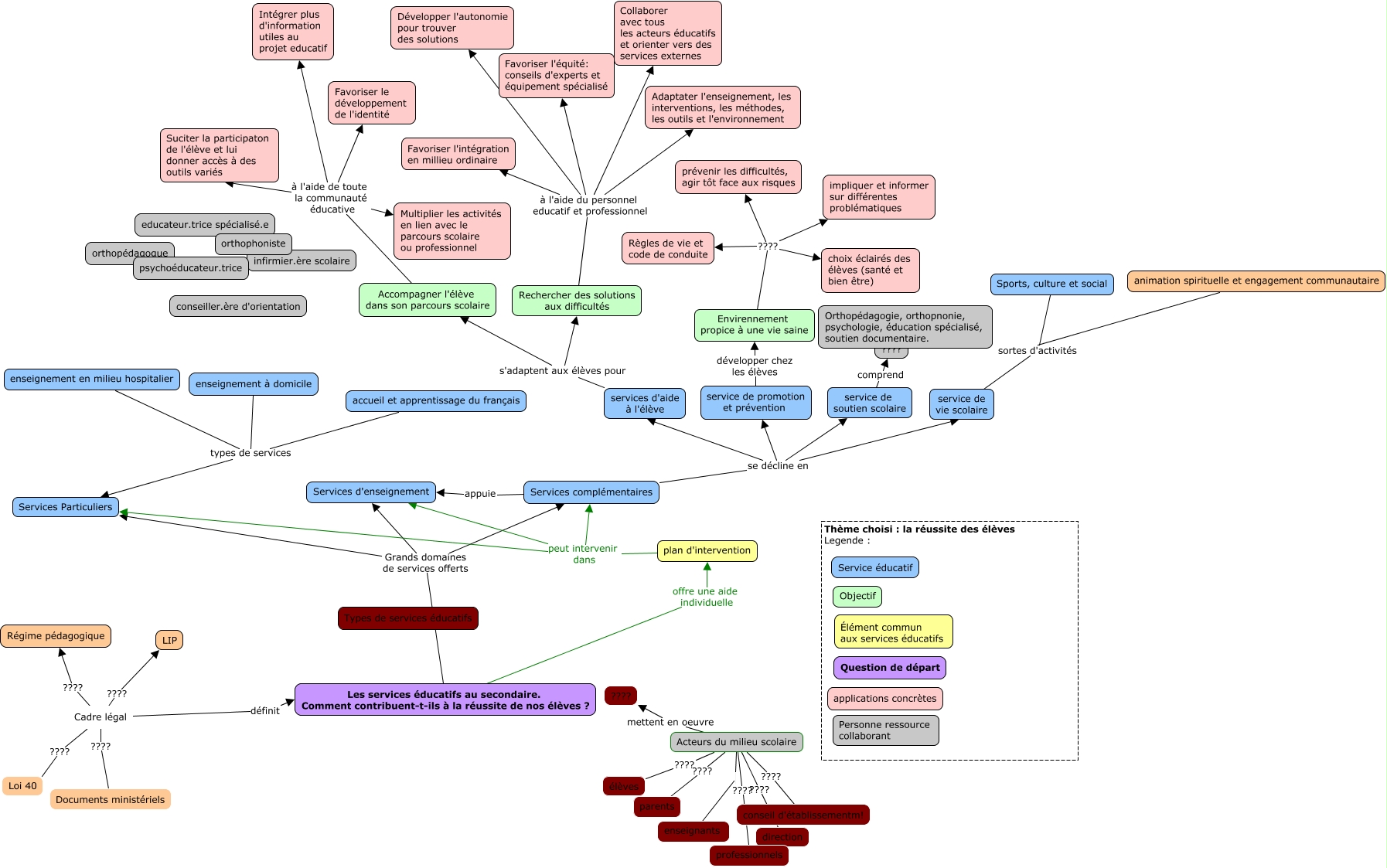 Cette carte de concepts créée avec IHMC CmapTools traite de: Sans titre, Cadre légal ???? LIP, enseignement en milieu hospitalier types de services Services Particuliers, Services complémentaires se décline en service de vie scolaire, Accompagner l'élève dans son parcours scolaire à l'aide de toute la communauté éducative Multiplier les activités en lien avec le parcours scolaire ou professionnel, Accompagner l'élève dans son parcours scolaire à l'aide de toute la communauté éducative Suciter la participaton de l'élève et lui donner accès à des outils variés, Acteurs du milieu scolaire ???? élèves, Rechercher des solutions aux difficultés à l'aide du personnel educatif et professionnel Favoriser l'équité: conseils d'experts et équipement spécialisé, plan d'intervention peut intervenir dans Services d'enseignement, animation spirituelle et engagement communautaire sortes d'activités service de vie scolaire, Les services éducatifs au secondaire. Comment contribuent-t-ils à la réussite de nos élèves ? Grands domaines de services offerts Services complémentaires, Envirennement propice à une vie saine ???? Règles de vie et code de conduite, Acteurs du milieu scolaire mettent en oeuvre ????, Services complémentaires appuie Services d'enseignement, Acteurs du milieu scolaire ???? professionnels, services d'aide à l'élève s'adaptent aux élèves pour Rechercher des solutions aux difficultés, Cadre légal ???? Régime pédagogique, service de soutien scolaire comprend ????, Services complémentaires se décline en service de soutien scolaire, Accompagner l'élève dans son parcours scolaire à l'aide de toute la communauté éducative Favoriser le développement de l'identité, Envirennement propice à une vie saine ???? impliquer et informer sur différentes problématiques
