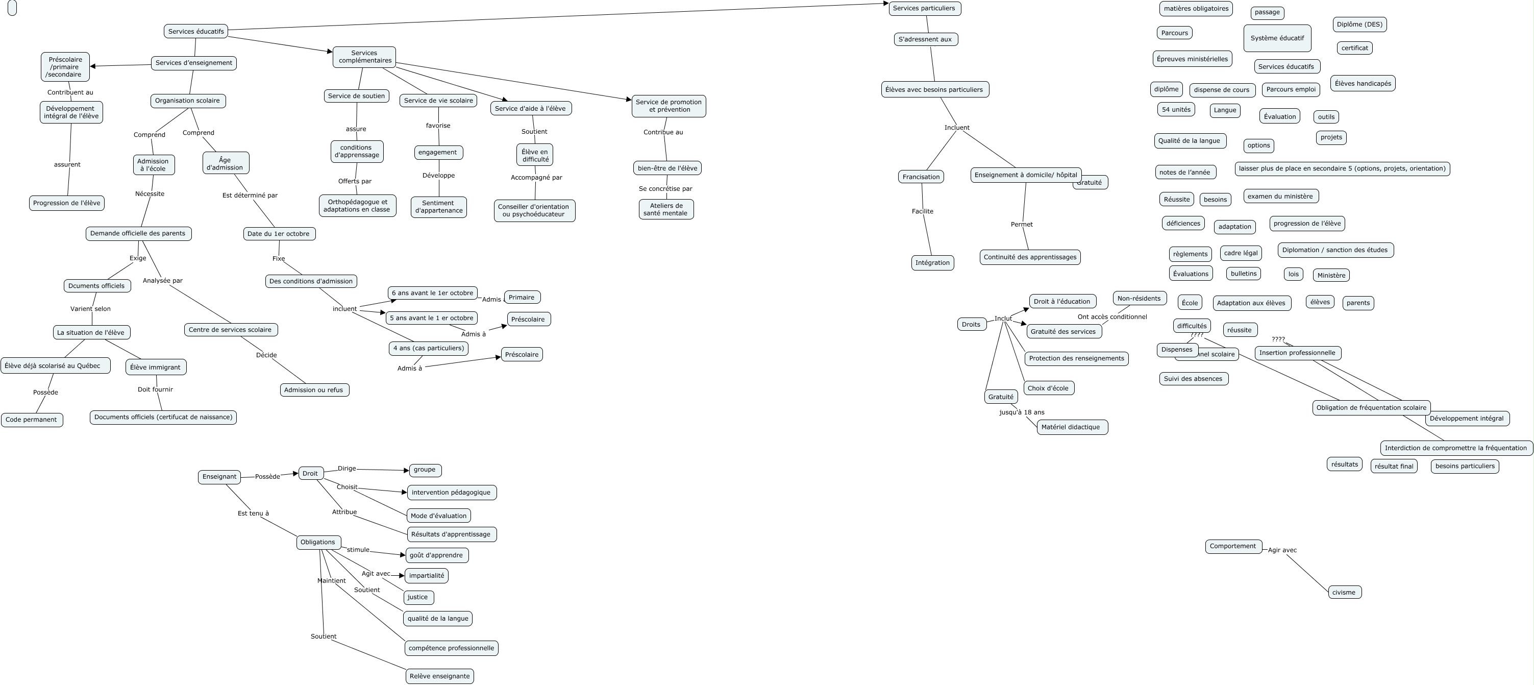 Cette carte de concepts créée avec IHMC CmapTools traite de: Carte conceptuelle D_Larkin Y_Zaoui.cmap 2, bien-être de l'élève Se concrétise par Ateliers de santé mentale, Services éducatifs Services complémentaires, engagement Développe Sentiment d'appartenance, Élèves avec besoins particuliers Incluent Francisation, Élève en difficulté Accompagné par Conseiller d'orientation ou psychoéducateur, Des conditions d'admission incluent 6 ans avant le 1er octobre, Obligations stimule goût d'apprendre, Services particuliers Aide Élèves avec besoins particuliers, Services complémentaires Service d'aide à l'élève, Obligations Agit avec justice, Droits Inclut Gratuité des services, Élève déjà scolarisé au Québec Possède Code permanent, 6 ans avant le 1er octobre Admis à Primaire, Élève immigrant Doit fournir Documents officiels (certifucat de naissance), 5 ans avant le 1 er octobre Admis à Préscolaire, Des conditions d'admission incluent 5 ans avant le 1 er octobre, Admission à l'école Nécessite Demande officielle des parents, Obligations Agit avec impartialité, Enseignant Possède Droit, Francisation Facilite Intégration