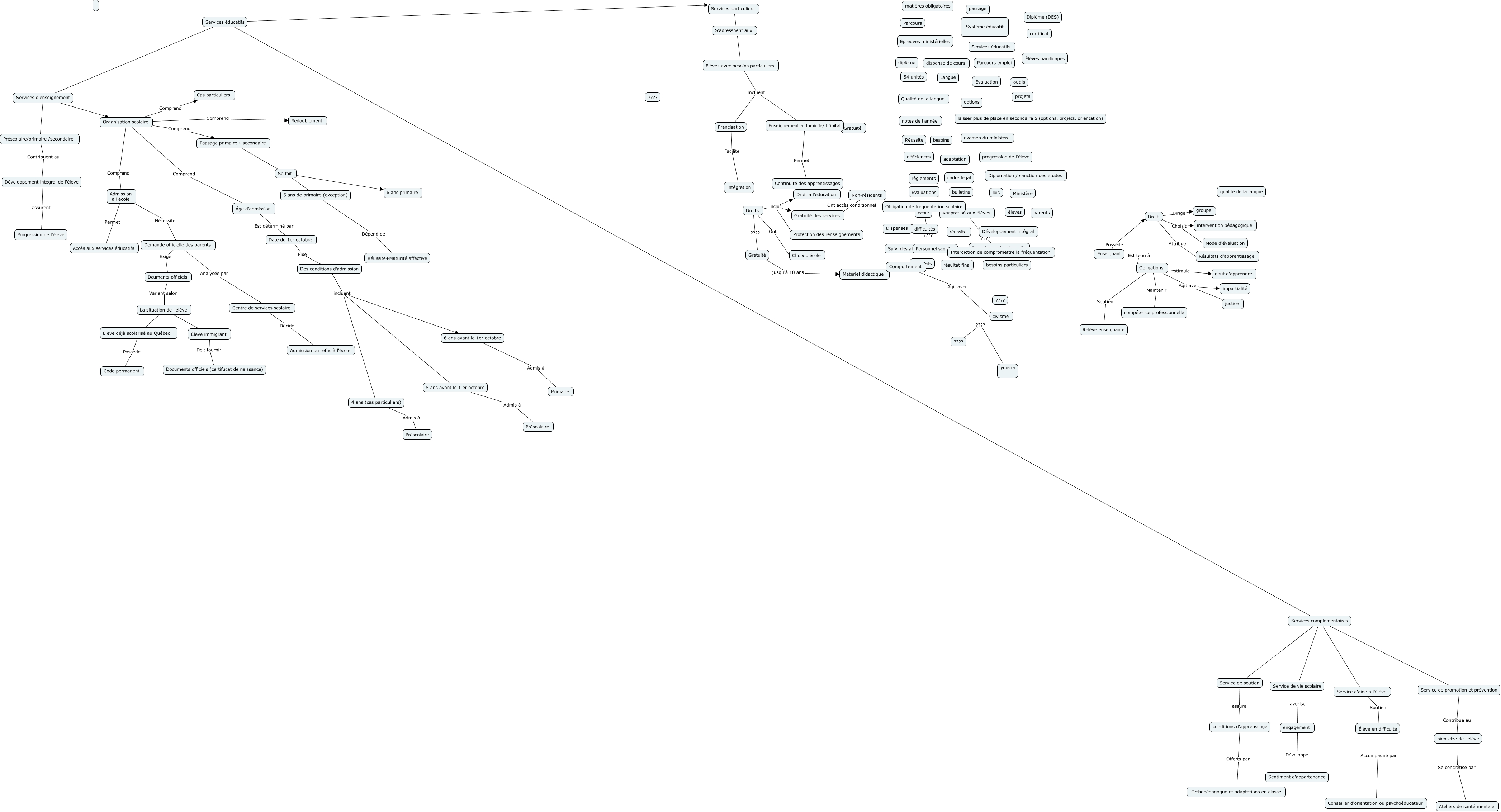 Cette carte de concepts créée avec IHMC CmapTools traite de: Carte conceptuelle D_Larkin Y_Zaoui.cmap 1.1 2, Francisation Facilite Intégration, 5 ans avant le 1 er octobre Admis à Préscolaire, La situation de l'élève Élève immigrant, Services complémentaires Service de promotion et prévention, Services complémentaires Service de soutien, Organisation scolaire Comprend Admission à l'école, Se fait 6 ans primaire, Services particuliers Aide Élèves avec besoins particuliers, Élève déjà scolarisé au Québec Possède Code permanent, Dispenses ???? Obligation de fréquentation scolaire, engagement Développe Sentiment d'appartenance, Droits Inclut Gratuité des services, 5 ans de primaire (exception) Dépend de Réussite+Maturité affective, Services d’enseignement Organisation scolaire, Droits ???? Gratuité, yousra ???? ????, Des conditions d'admission incluent 5 ans avant le 1 er octobre, Date du 1er octobre Fixe Des conditions d'admission, Élèves avec besoins particuliers Incluent Enseignement à domicile/ hôpital, Services éducatifs Services particuliers