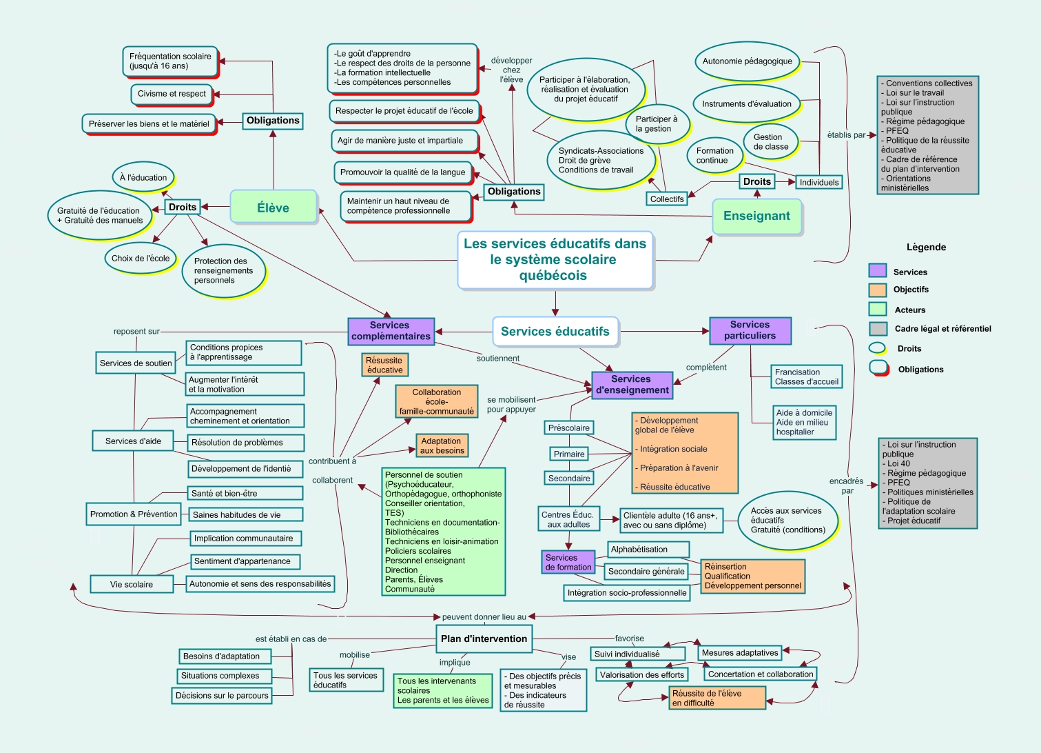 Cette carte de concepts créée avec IHMC CmapTools traite de: Brouillon-Imen Boughattas2, Plan d'intervention favorise Suivi individualisé, Obligations Respecter le projet éducatif de l'école, encadrés par ????, Droits Gratuité de l'éducation + Gratuité des manuels, Promotion & Prévention Vie scolaire, Obligations Préserver les biens et le matériel, Intégration socio-professionnelle Réinsertion Qualification Développement personnel, Participer à la gestion Participer à l'élaboration, réalisation et évaluation du projet éducatif, contribuent à collaborent Collaboration école- famille-communauté, Plan d'intervention est établi en cas de Situations complexes, Services d'aide Promotion & Prévention, Vie scolaire Implication communautaire, Élève Obligations, Services éducatifs Services particuliers, Secondaire générale Réinsertion Qualification Développement personnel, Services éducatifs Services d'enseignement, Droits Services complémentaires, Obligations Maintenir un haut niveau de compétence professionnelle, Secondaire - Développement global de l'élève - Intégration sociale - Préparation à l'avenir - Réussite éducative, Élève Droits
