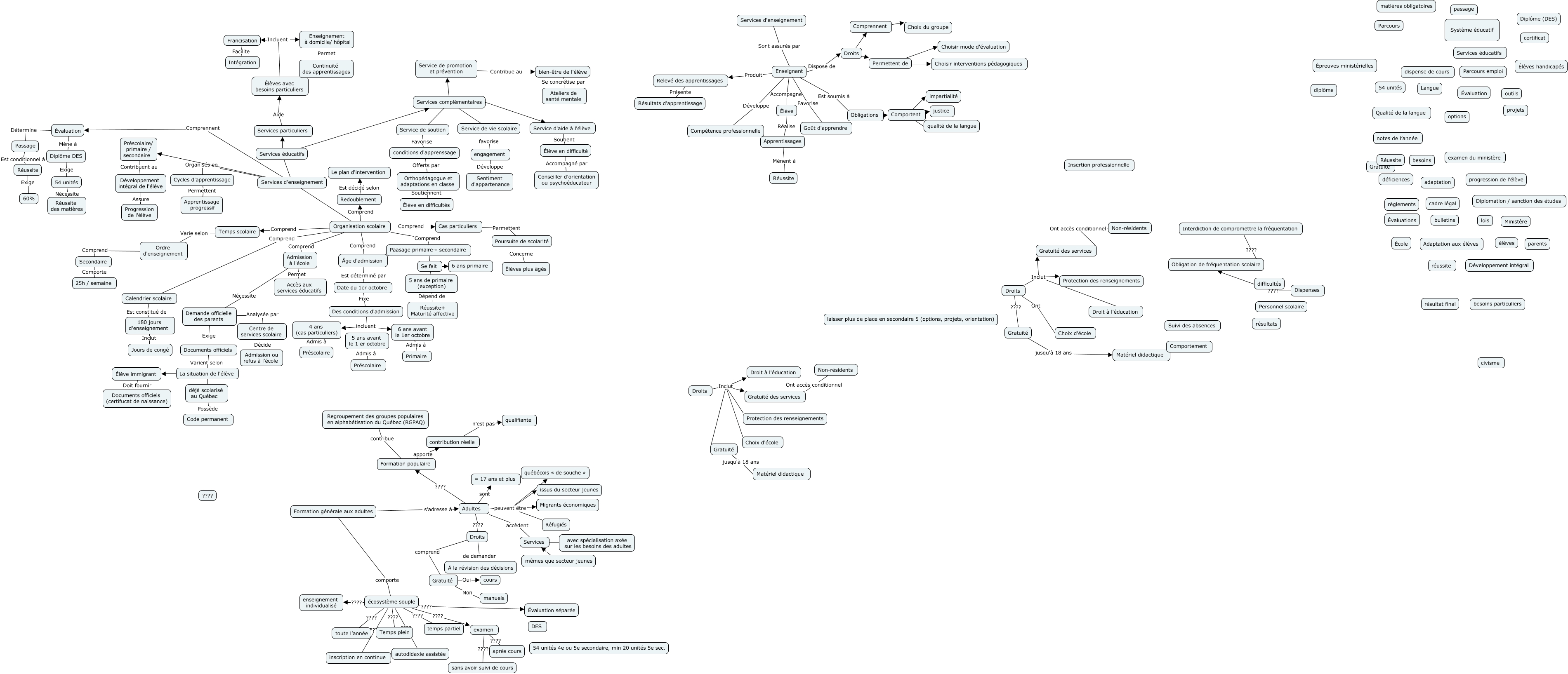 Cette carte de concepts créée avec IHMC CmapTools traite de: CMAP 5.4, Comprennent Choix du groupe, Date du 1er octobre Fixe Des conditions d'admission, Services complémentaires Service de promotion et prévention, Francisation Facilite Intégration, Élève immigrant Doit fournir Documents officiels (certifucat de naissance), Apprentissages Mènent à Réussite, Droits Inclut Droit à l'éducation, Adultes ???? Droits, Permettent de Choisir mode d'évaluation, Services d’enseignement Préscolaire/ primaire / secondaire, Organisation scolaire Comprend Temps scolaire, 4 ans (cas particuliers) Admis à Préscolaire, Cycles d'apprentissage Permettent Apprentissage progressif, écosystème souple ???? enseignement individualisé, Non-résidents Ont accès conditionnel Gratuité des services, Gratuité Oui cours, Élèves avec besoins particuliers Incluent Francisation, Droits Ont Choix d'école, Adultes ???? Formation populaire, Interdiction de compromettre la fréquentation ???? Obligation de fréquentation scolaire
