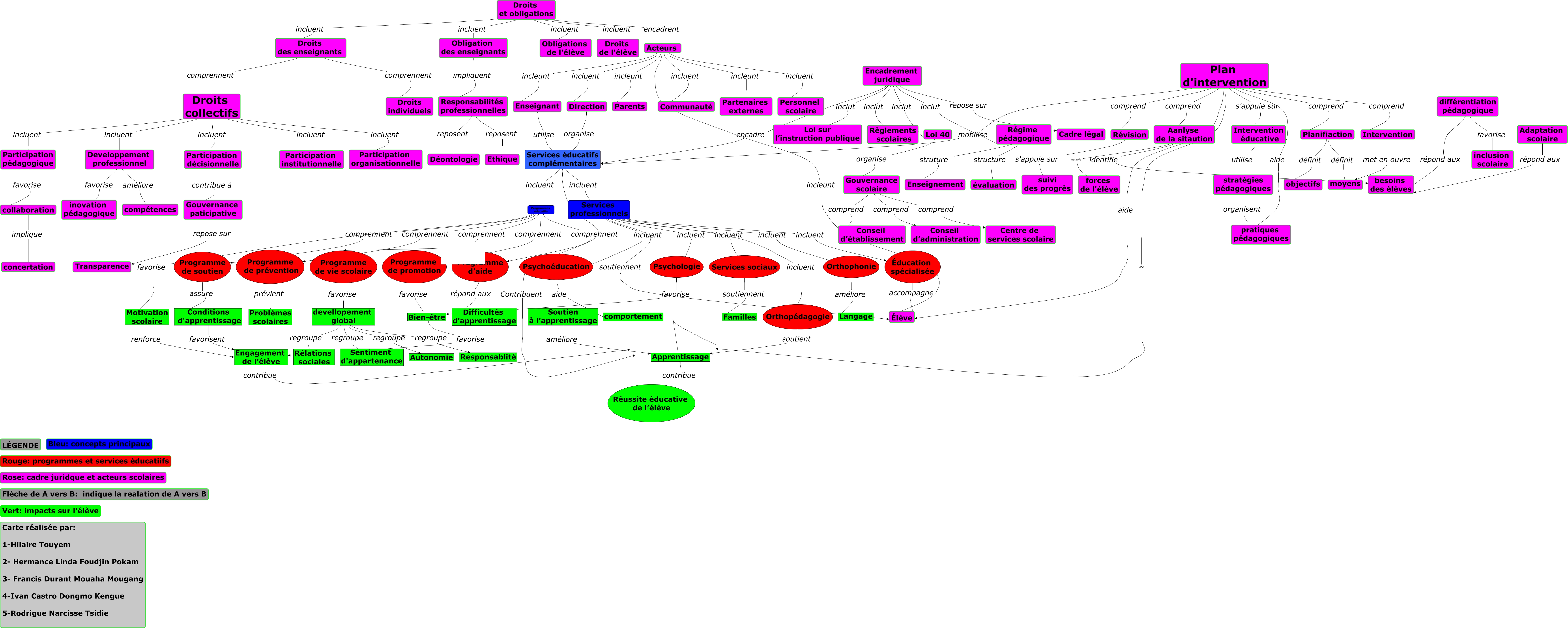Cette carte de concepts créée avec IHMC CmapTools traite de: Groupe_T_Cmap, Developpement professionnel améliore compétences, Acteurs incleunt Partenaires externes, devellopement global regroupe Autonomie, stratégies pédagogiques organisent pratiques pédagogiques, Droits collectifs incluent Participation pédagogique, Gouvernance scolaire comprend Conseil d’établissement, Droits et obligations incluent Obligations de l'élève, Droits et obligations incluent Droits des enseignants, Services professionnels incluent Orthopédagogie, Psychologie favorise Bien-être, Enseignant utilise Services éducatifs complémentaires, Orthopédagogie soutient Apprentissage, Services professionnels incluent Psychologie, Plan d'intervention comprend Aanlyse de la sitaution, Adaptation scolaire répond aux besoins des élèves, Régime pédagogique structure évaluation, Loi 40 organise Gouvernance scolaire, Programmes éducatifs comprennent Programme d’aide, Aanlyse de la sitaution identifie forces de l'élève, Acteurs incluent Direction