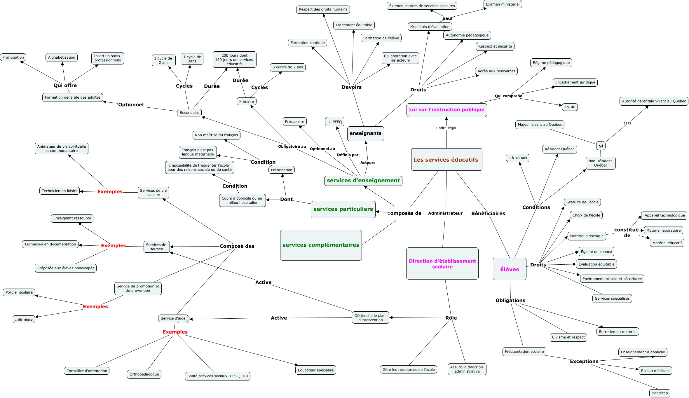 Cette carte de concepts créée avec IHMC CmapTools traite de: carte conceptuelle, Élèves Droits Gratuité de l'école, Les services éducatifs Administrateur Direction d'établissement scolaire, Formation générale des adultes Qui offre Insertion socio- professionnelle, Élèves Conditions 5 à 18 ans, enseignants Droits Modalités d'évaluation, Déclenche le plan d'intervention Active ????, Primaire Cycles 3 cycles de 2 ans, Élèves Droits Choix de l'école, Les services éducatifs Composés de services complémentaires, Cours à domicile ou en milieu hospitalier Condition Impossibilité de fréquenter l'école pour des raisons sociale ou de santé, Élèves Conditions Résident Québec, Direction d'établissement scolaire Rôle Déclenche le plan d'intervention, Élèves Obligations Fréquentation scolaire, enseignants Droits Autonomie pédagogique, Matériel didactique constitué de Matériel éducatif, Modalités d'évaluation Sauf Examen centres de services scolaires, Services de vie scolaire Exemples Technicien en loisirs, Modalités d'évaluation Sauf Examen ministériel, Direction d'établissement scolaire Rôle Gère les ressources de l'école, services complémentaires Composé des Service de promotion et de prévention
