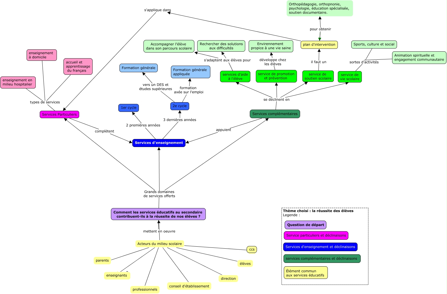 Cette carte de concepts créée avec IHMC CmapTools traite de: Au cas, Services complémentaires appuient Services d'enseignement, Acteurs du milieu scolaire mettent en oeuvre Comment les services éducatifs au secondaire contribuent-ils à la réussite de nos élèves ?, Acteurs du milieu scolaire la direction, services d'aide à l'élève s'adaptent aux élèves pour Accompagner l'élève dans son parcours scolaire, Comment les services éducatifs au secondaire contribuent-ils à la réussite de nos élèves ? Grands domaines de services offerts Services Particuliers, Animation spirituelle et engagement communautaire sortes d'activités service de vie scolaire, Services Particuliers complètent Services d'enseignement, Acteurs du milieu scolaire un conseil d'établissement, Services complémentaires se déclinent en services d'aide à l'élève, Services complémentaires se déclinent en service de promotion et prévention, service de promotion et prévention développe chez les élèves Envirennement propice à une vie saine, 2e cycle formation axée sur l'emploi Formation générale appliquée, Acteurs du milieu scolaire des parents, plan d'intervention s'applique dans Services Particuliers, Services d'enseignement 2 premières années 1er cycle, accueil et apprentissage du français types de services Services Particuliers, plan d'intervention pour obtenir Orthopédagogie, orthopnonie, psychologie, éducation spécialisée, soutien documentaire., Services complémentaires se déclinent en service de soutien scolaire, enseignement à domicile types de services Services Particuliers, Acteurs du milieu scolaire des professionnels