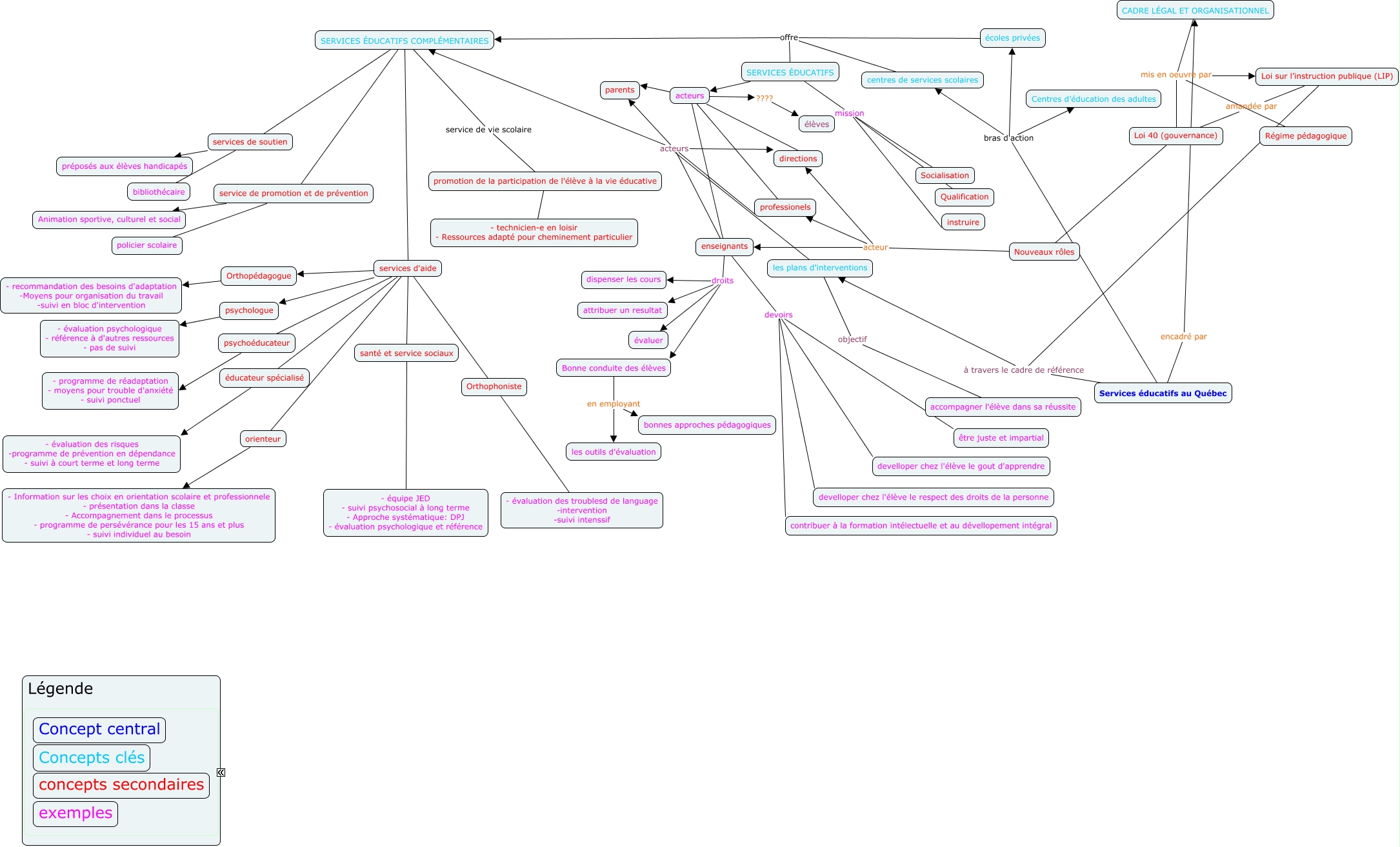 Cette carte de concepts créée avec IHMC CmapTools traite de: Copie de équipe 5, santé et service sociaux - équipe JED - suivi psychosocial à long terme - Approche systématique: DPJ - évaluation psychologique et référence, acteurs professionels, promotion de la participation de l'élève à la vie éducative - technicien-e en loisir - Ressources adapté pour cheminement particulier, enseignants droits attribuer un resultat, Services éducatifs au Québec encadré par CADRE LÉGAL ET ORGANISATIONNEL, Services éducatifs au Québec bras d'action écoles privées, Orthophoniste - évaluation des troublesd de language -intervention -suivi intenssif, enseignants devoirs contribuer à la formation intélectuelle et au dévellopement intégral, les plans d'interventions acteurs enseignants, les plans d'interventions acteurs parents, Nouveaux rôles acteur enseignants, orienteur - Information sur les choix en orientation scolaire et professionnele - présentation dans la classe - Accompagnement dans le processus - programme de persévérance pour les 15 ans et plus - suivi individuel au besoin, centres de services scolaires offre SERVICES ÉDUCATIFS, services de soutien bibliothécaire, Bonne conduite des élèves en employant les outils d'évaluation, psychoéducateur - programme de réadaptation - moyens pour trouble d'anxiété - suivi ponctuel, Orthopédagogue - recommandation des besoins d'adaptation -Moyens pour organisation du travail -suivi en bloc d'intervention, services d'aide psychoéducateur, SERVICES ÉDUCATIFS mission instruire, Loi 40 (gouvernance) Nouveaux rôles