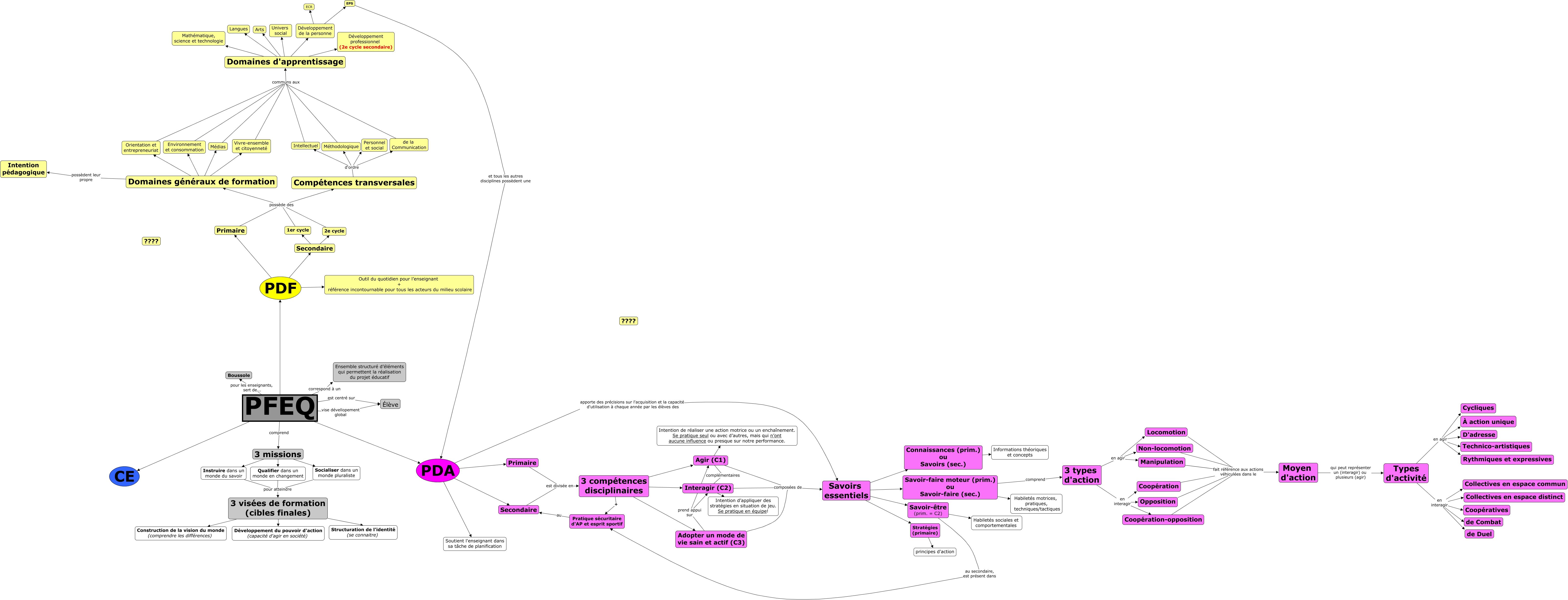 Cette carte de concepts créée avec IHMC CmapTools traite de: Compétences disciplinaires, Interagir (C2) composées de Savoirs essentiels, Adopter un mode de vie sain et actif (C3) prend appui sur Agir (C1), 3 visées de formation (cibles finales) Structuration de l'identité (se connaitre), Méthodologique communs aux Domaines d'apprentissage, PDA apporte des précisions sur l'acquisition et la capacité d'utilisation à chaque année par les élèves des Savoirs essentiels, Domaines généraux de formation Orientation et entrepreneuriat, Développement de la personne EPS, Types d'activité en agir Technico-artistiques, Compétences transversales d'ordre de la Communication, de la Communication communs aux Domaines d'apprentissage, Types d'activité en interagir Collectives en espace distinct, Médias communs aux Domaines d'apprentissage, PFEQ comprend 3 missions, Locomotion fait référence aux actions véhiculées dans le Moyen d'action, Compétences transversales d'ordre Méthodologique, Savoirs essentiels Connaissances (prim.) ou Savoirs (sec.), Types d'activité en interagir de Combat, Savoir-faire moteur (prim.) ou Savoir-faire (sec.) Habiletés motrices, pratiques, techniques/tactiques, PDA Primaire, PDA Secondaire